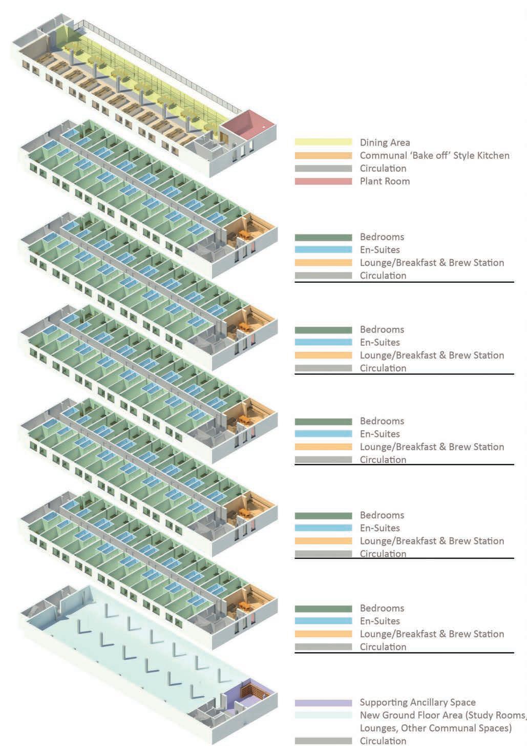 This scheme was a feasibility study, followed by conceptual design, for a new student accommodation development for Bolton University. Within this I engaged heavily with the developers and client which enabled me to liaise with external design team members and attain experience in project delivery. This scheme was part of a larger master plan and was proposed to be delivered using modular solutions which were considered during the early design stages.