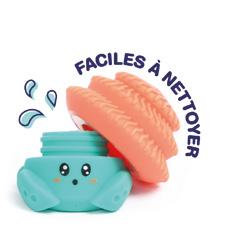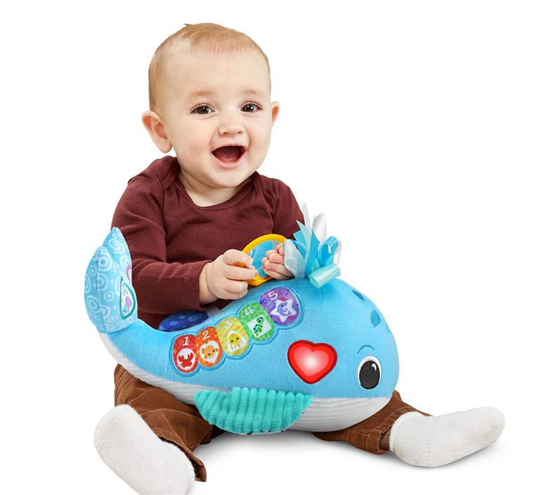 Un bouton coeur lumineux permet d’entendre des anecdotes sur la baleine et 2 boutons interactifs déclenchent des chansons, des mélodies et des sons du monde marin. 3+ mois