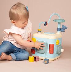 13 activités mécaniques différentes sur 5 faces de jeu pour développer la motricité, y compris un trieur de formes, un boulier, des engrenages, une roue à aubes et un cric-crac coccinelle. 4 accessoires inclus. Fabriqué en France. 12+ mois