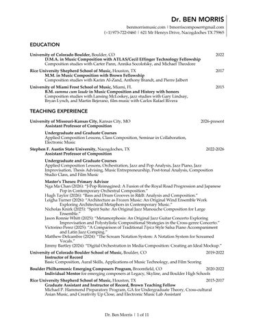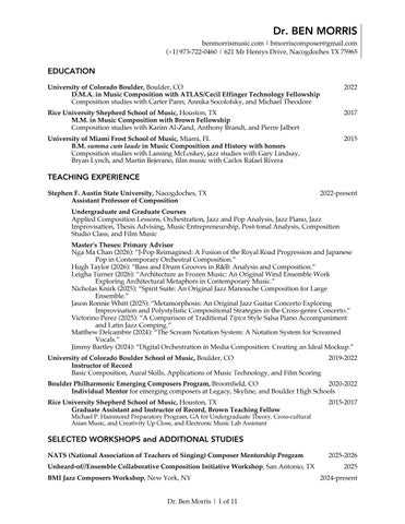 Ben Morris is a composer whose music tells unconventional stories and crosses genre boundaries. He is Assistant Professor of Composition at Stephen F. Austin State University.