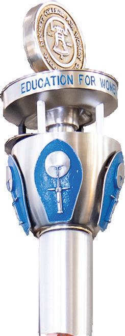 The mace, a ceremonial insignia, dates to ancient Rome to honor heroes and nobility. Maces were later used in the courts of England, during the reign of James I, as symbols of authority. Today, maces are associated with academic and governmental processions. In academic use, it is the symbol of the College or University, as a body of scholars within its own legally constituted authority. The chief marshal carries the mace during all formal academic processions. Approximately 36 inches in length, the mace is made of metal (copper, bronze and brass) with a tapered shaft and an engraved globe at the bottom (symbolic of the College’s international link with the world.) The College seal, which rests atop the mace, is mounted vertically. Beneath the seal, around the top of the “trapezoid” is the College’s purpose (EDUCATION FOR WOMEN). The “trapezoid” bowl section below the posts is embellished with a series of Akuba figurines (West African symbols of womanhood) affixed to magnolia leaf outlines. Magnolia trees are a longstanding symbol adorning the Bennett College campus. The mace, created by Emblem and Badge, Inc., Providence, Rhode Island, was designed by Congresswoman Dr. Alma S. Adams, a retired Bennett professor.