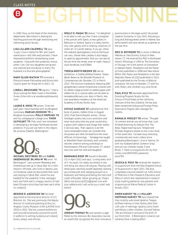 LISA LILLARD CALDWELL ’76 says, “Lucky I live in Santa Fe, NM, and I paint watercolors—still lifes and portraits. I have rheumatoid arthritis necessitating some surgeries. I sing with the symphony chorus when I can. Our two daughters are grown, one married and one about to marry. My husband is a fine arts photographer.” MARY ELLEN WATKIN ’77 received a Pollack-Krasner Fellowship and Illinois Arts Council grant for Visual Art in 2011–12. LINDA L. BOUCHARD ’79 reports, “I had a show touring the West Coast in November. Some of the info is at murderouslittleworld. com.” LAURIE R. MOSS ’79 writes: “Over the past year I have reunited with my Bingham roommate, MARIAN JOHNSON ’79, a Bingham housemate, POLLY HOPKINS ’78, and my college/post-college love, THOM CATHCART ’79. Polly and I are interested in developing a stronger Northwest alumni presence. If you are out here in this region, let us know (Seattle, Washington).”