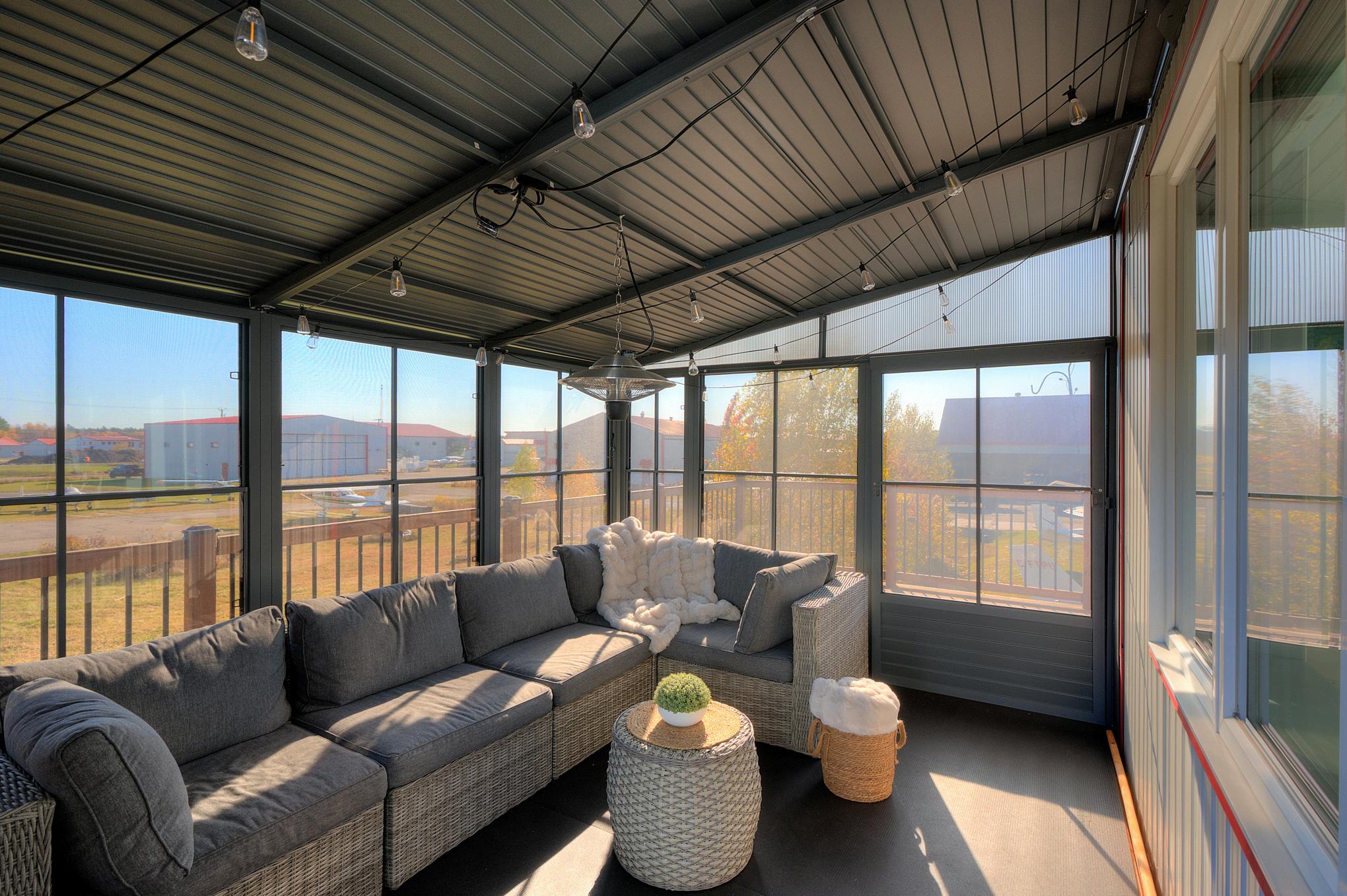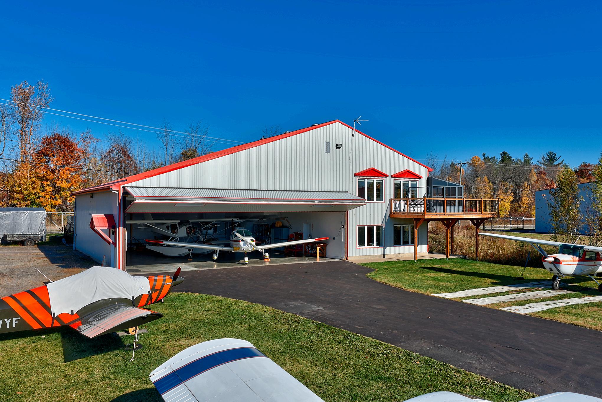 e hangar de +/- 3,200 pc, chauffé et isolé, permet d’abriter un ou plusieurs ppareils avec un accès direct au taxiway À l’étage, la résidence profite d’une aire uverte baignée de lumière, de grandes fenêtres orientées sud-est et d’une vue anoramique sur les pistes et les levers de soleil.