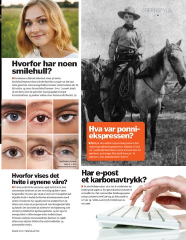 Hvorfor vises det hvite i øynene våre? n Vi kan se det hvite i øynene, også kalt sklera, hos mennesker fordi mer av det er synlig og det er uten fargestoffer. Teorien går ut på at dette utviklingstrekket skjedde fordi vi hadde behov for å kommunisere med andre. Forskerne har også funnet ut at størrelsen på sklera som vises er proporsjonalt med kroppsstørrelse og høyde. Det kan tyde på at dette er en tilpasning som utvider synsfeltet for øyebevegelsene, og det sparer energi siden vi ikke trenger å snu hodet så mye. Primater utenom mennesket har derimot en mørk sklera som skjuler blikket fra andre individer og potensielle rovdyr. WWW.NYVITENSKAP.NO