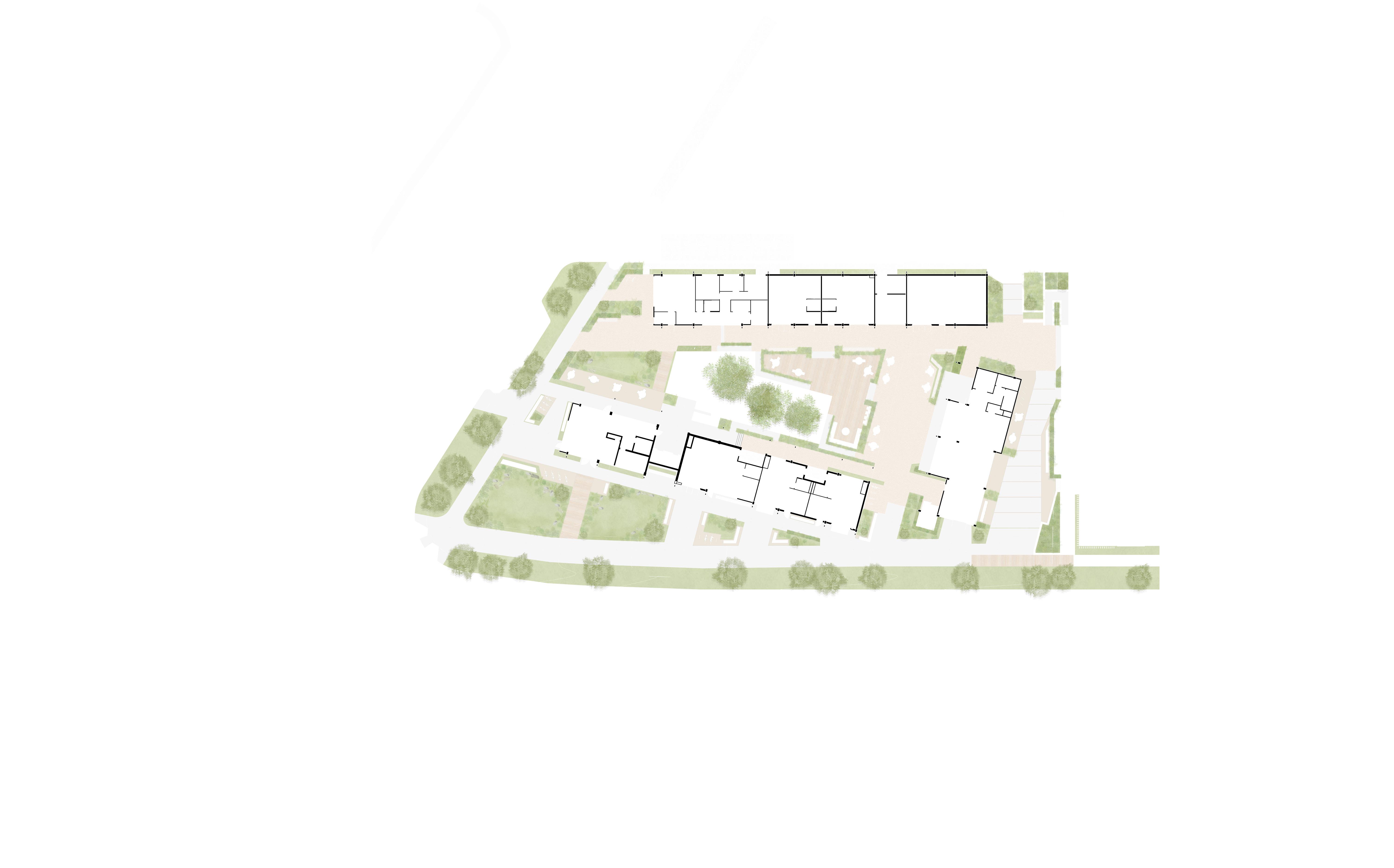 The streetfront mass is shortened to introduce a third, community-focused island that defines a more active and usable central courtyard, promoting community activities and gatherings while strengthening the project’s vision.