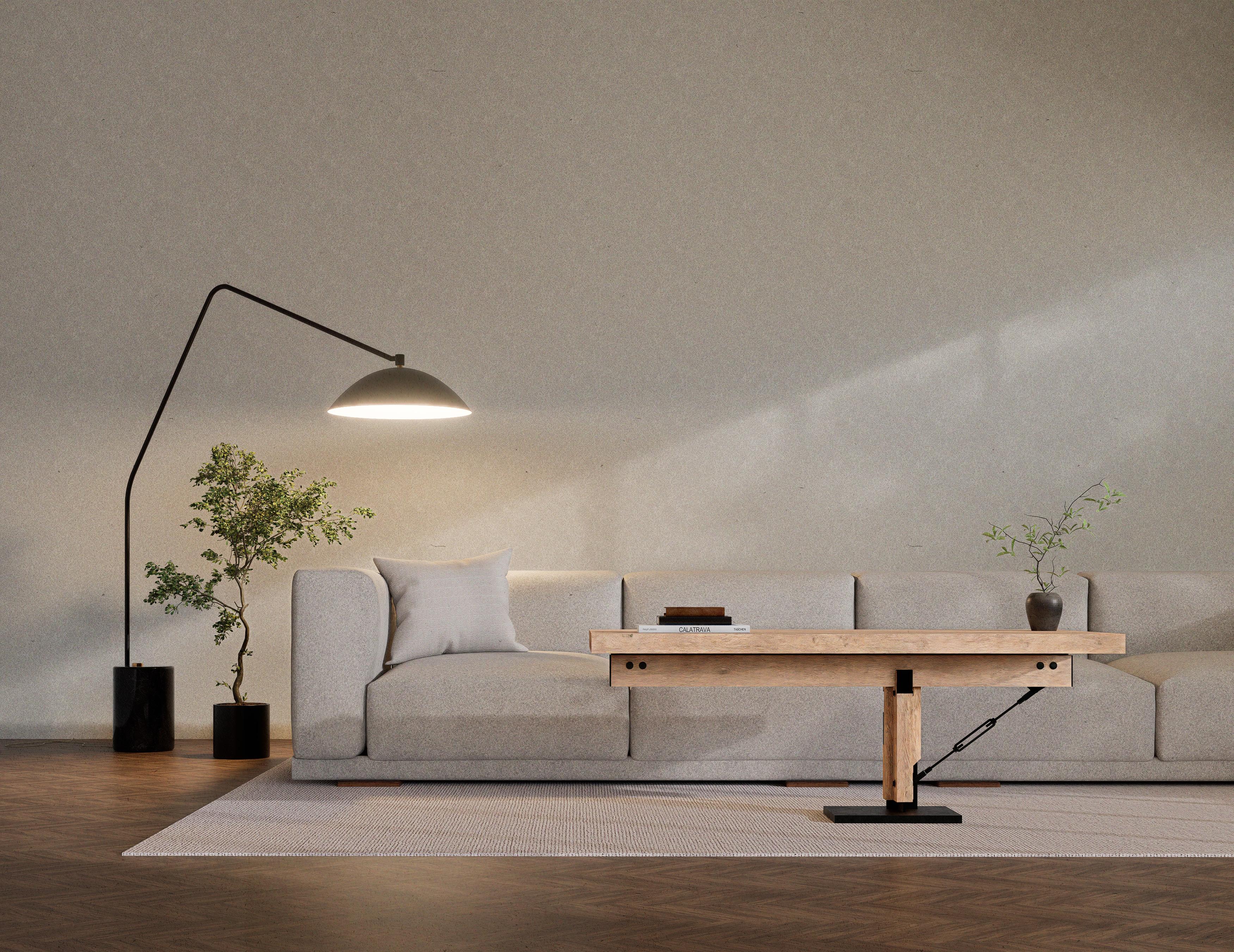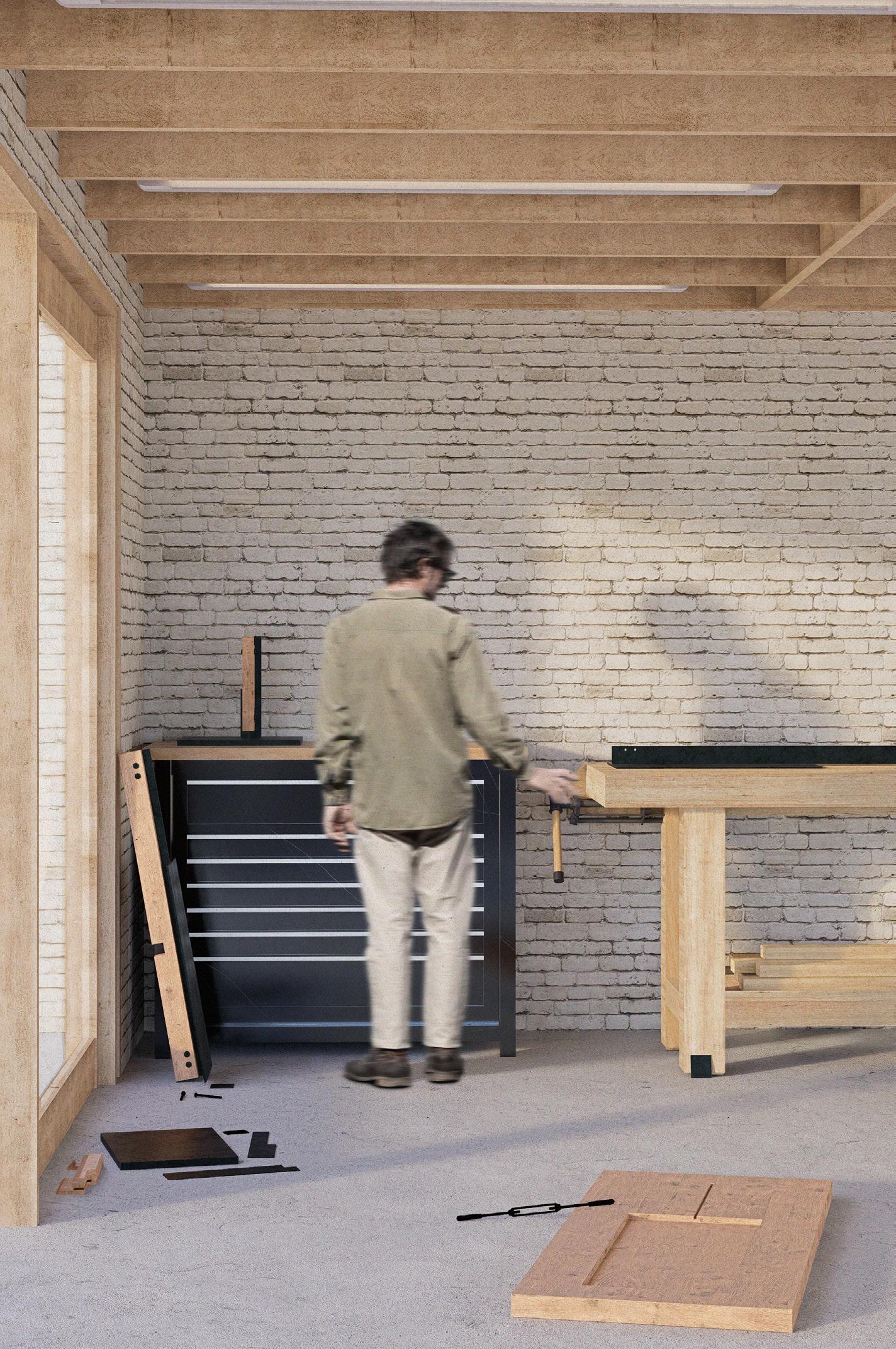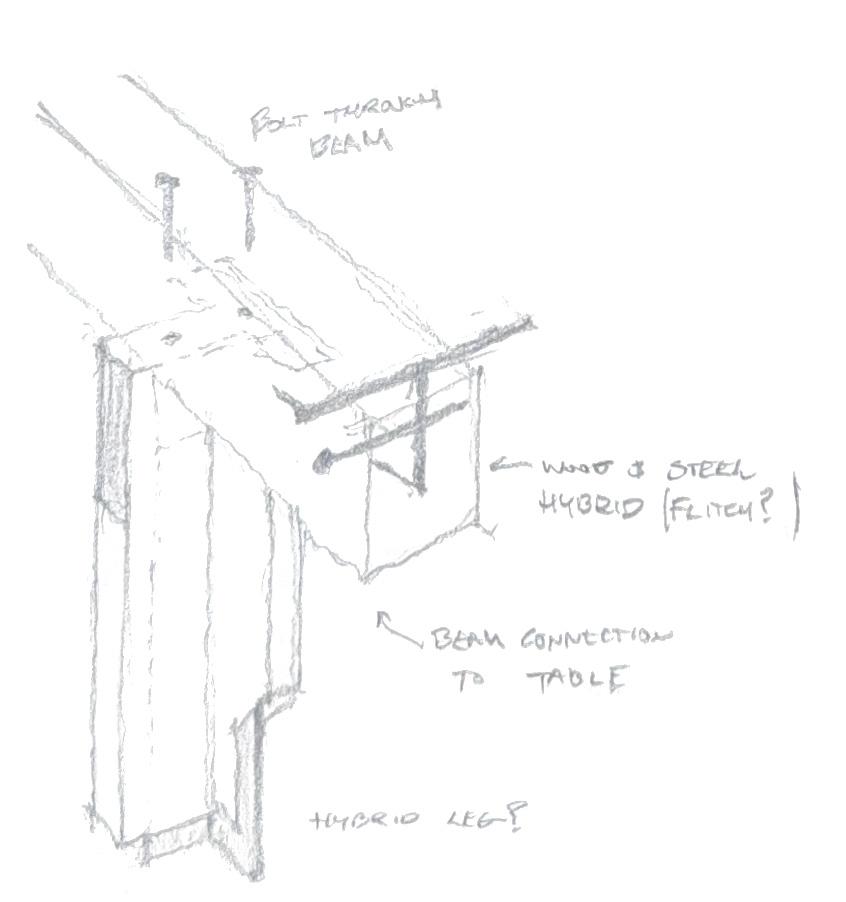 Construction is driven by a hybrid-wood and steel structural system, allowing both materials to work together to create seamless material transitions. First, two steel legs are welded to the base, establishing a heavy counterweight for the table. Wood sleeves slip over the steel, allowing for a clean connection to the beam while also concealing hardware on the interior. Above, two welded steel plates create the connection between the beam and the tabletop. This detail allows the table surface to float above the structure, reinforcing the cantilevered effect. Together, these integrated systems reinforce the table’s central idea: a refined balance through tension, weight, and support.