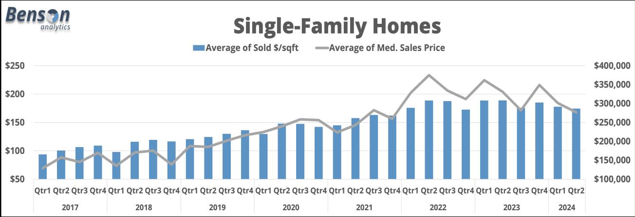 Although some local market areas don’t follow suit, the predominant housing type in Harris County are Single-Family (SF) homes. Looking at the performance of Q1/Q2 2024 compared with the same period a year ago, you can see that: