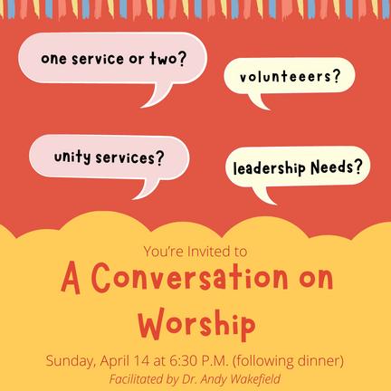 By now you ve likely seen the news regarding the upcoming conversation on worship happening Sunday April 14 at 6:30 P M We wanted to try and answer some of the questions we ’ ve heard heading into that meeting