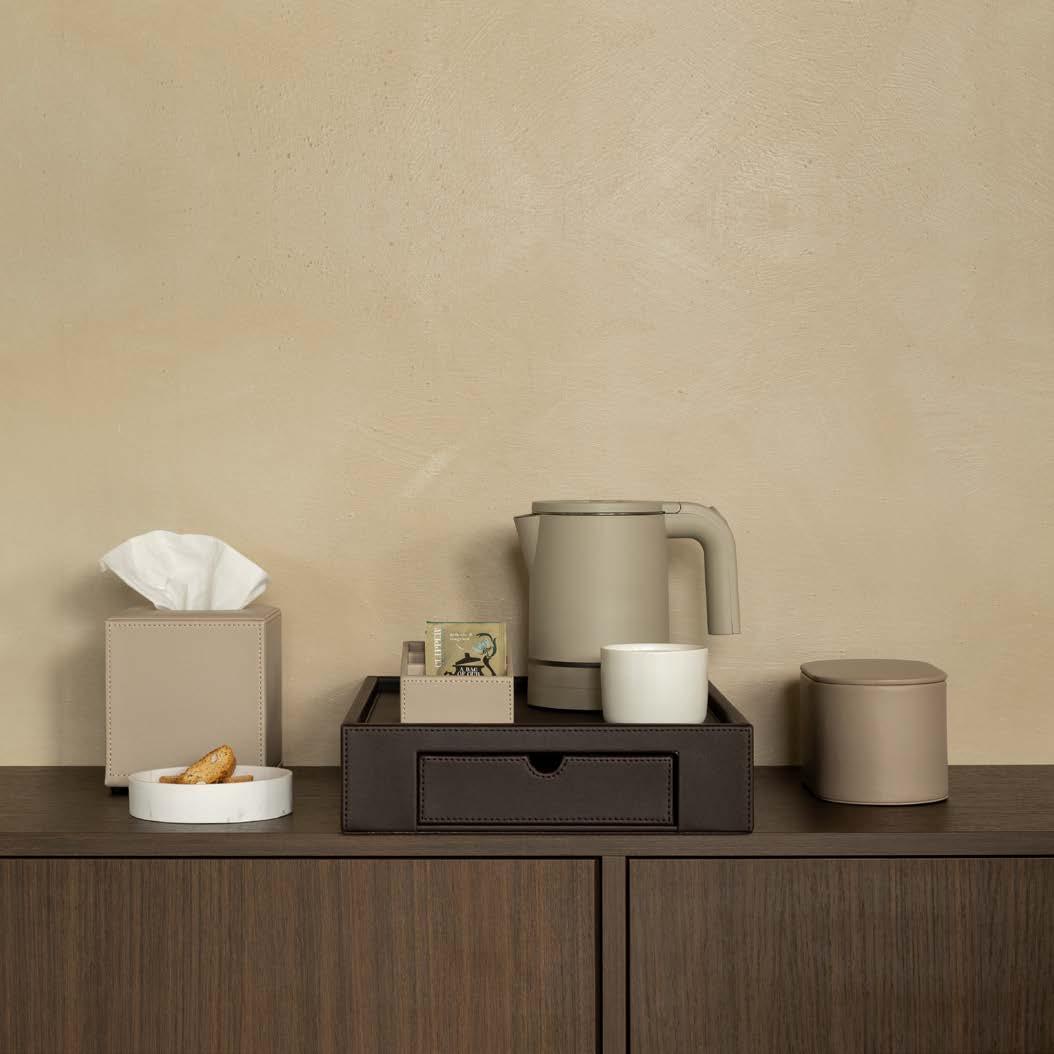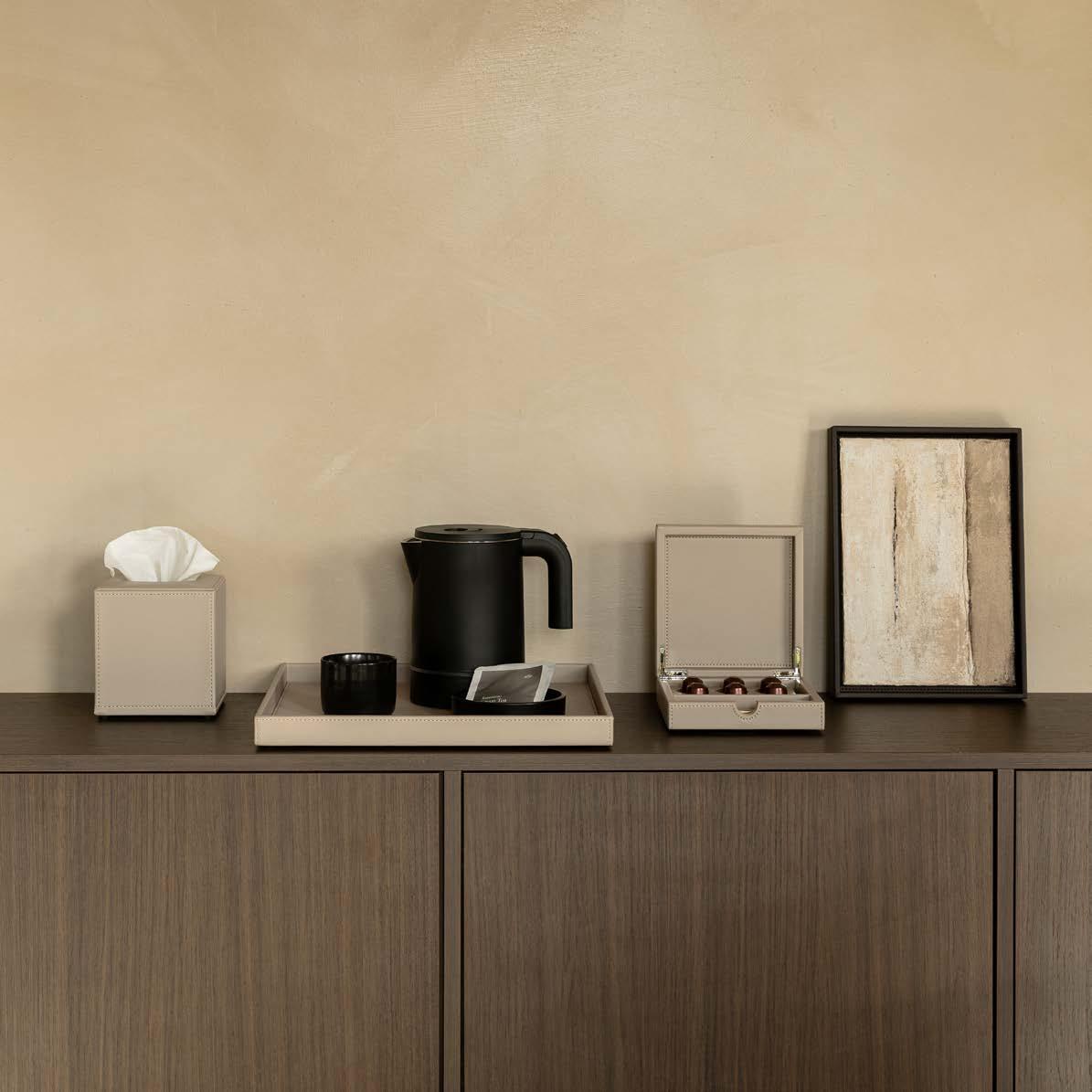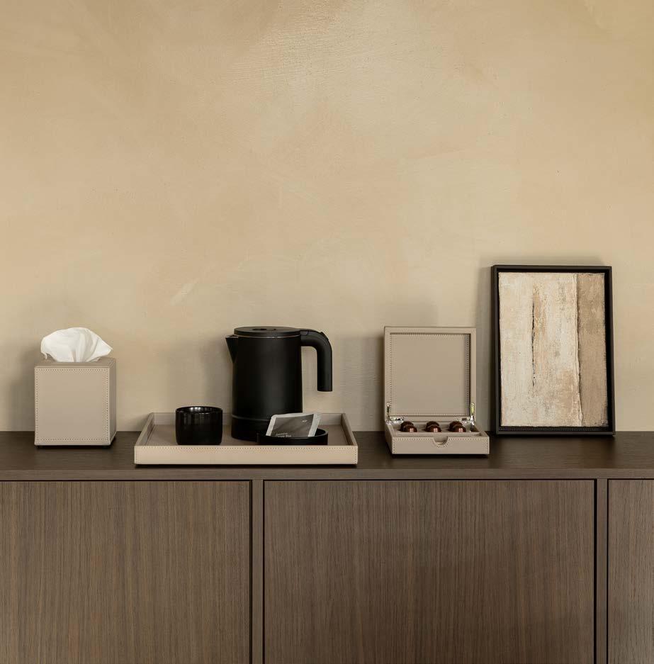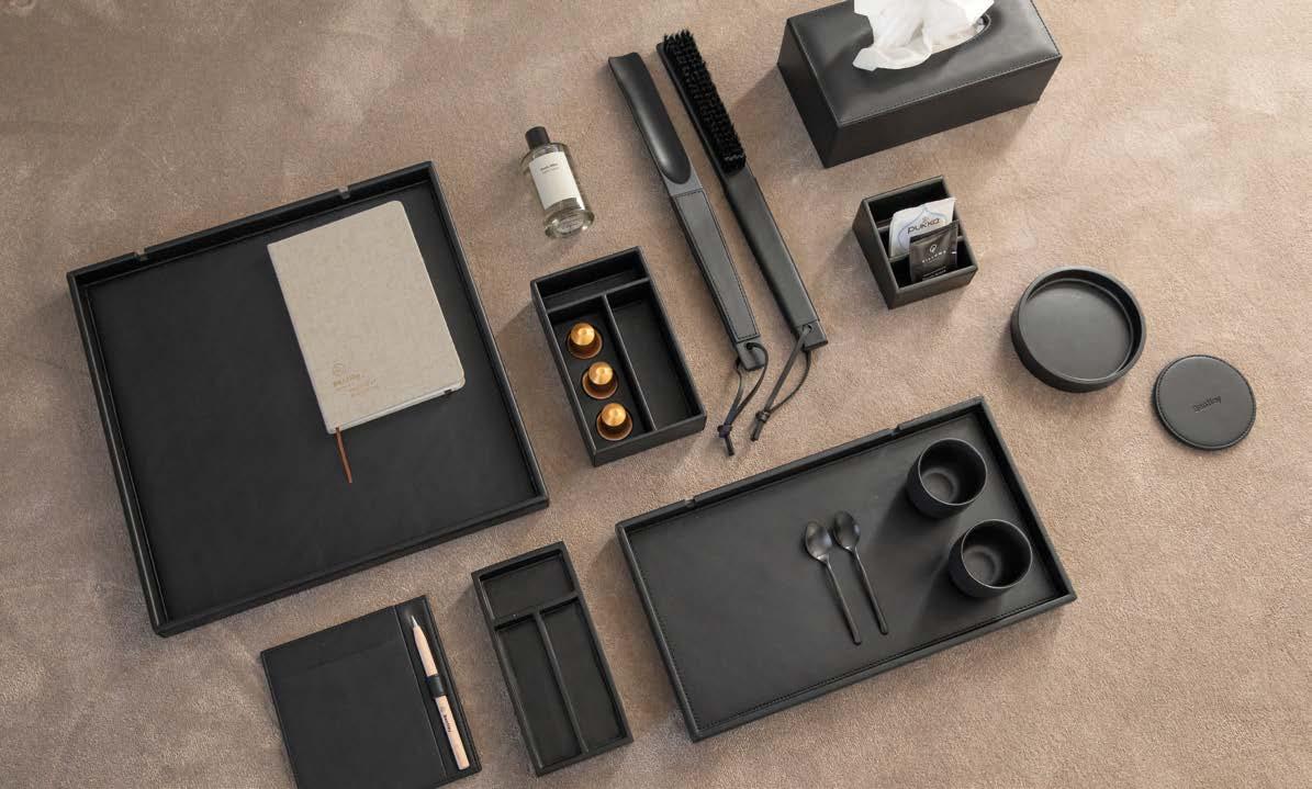 Every hotel tells its own story, shaped by atmosphere, detail, and design. With our customised solutions, we help you translate that story into the small, tactile details that leave a lasting impression. We offer an endless array of custom solutions. Wooden welcome trays can be finished in any colour to suit your interior, while our leatherette collection can be tailored in size, shape, and tone. Even metal luggage racks can be produced in refined finishes such as champagne, silver, or bronze. Add your hotel’s branding, and each piece becomes part of your signature look.