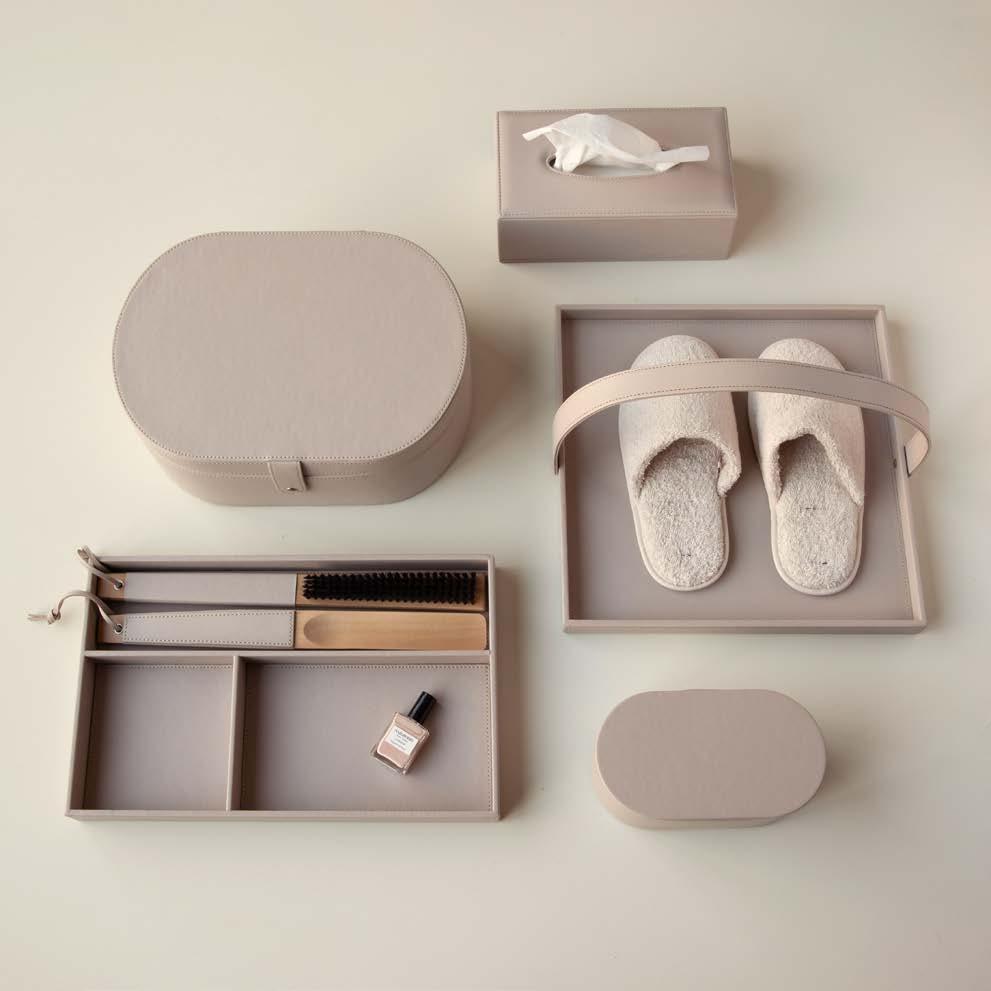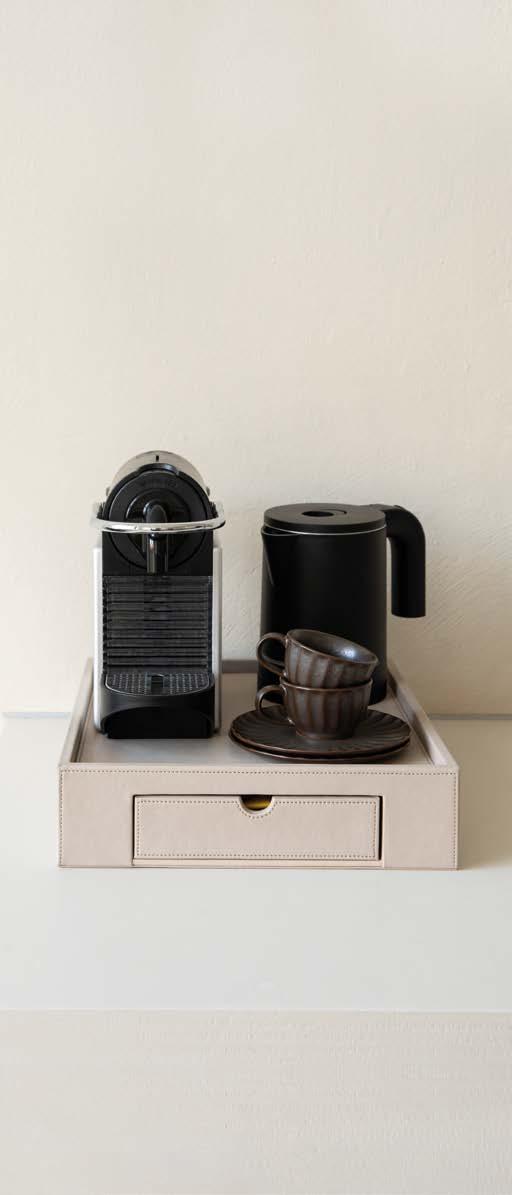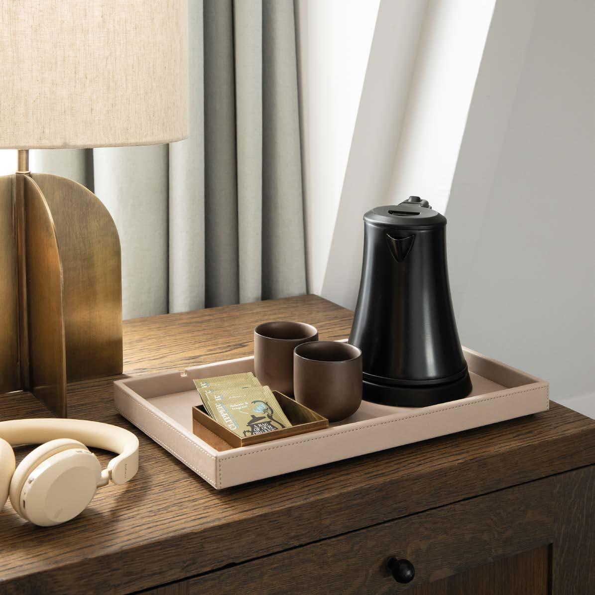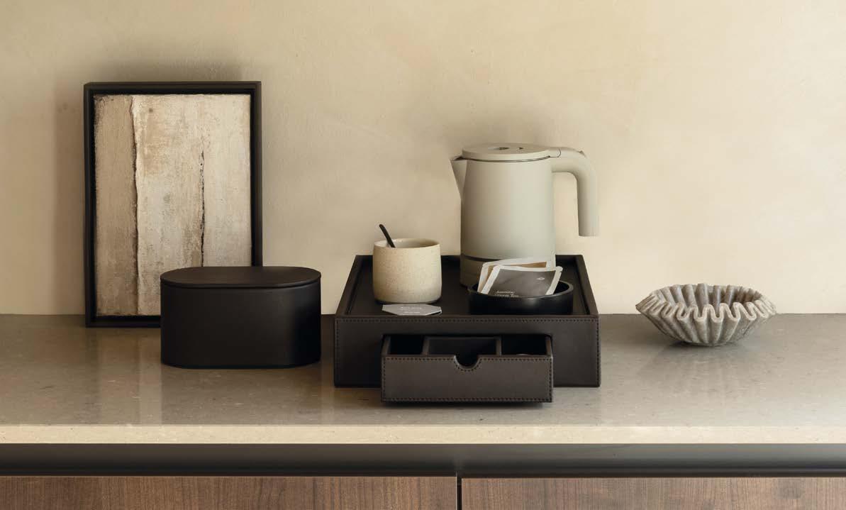 Every hotel tells its own story, shaped by atmosphere, detail, and design. With our customised solutions, we help you translate that story into the small, tactile details that leave a lasting impression. We offer an endless array of custom solutions. Wooden welcome trays can be finished in any colour to suit your interior, while our leatherette collection can be tailored in size, shape, and tone. Even metal luggage racks can be produced in refined finishes such as champagne, silver, or bronze. Add your hotel’s branding, and each piece becomes part of your signature look.