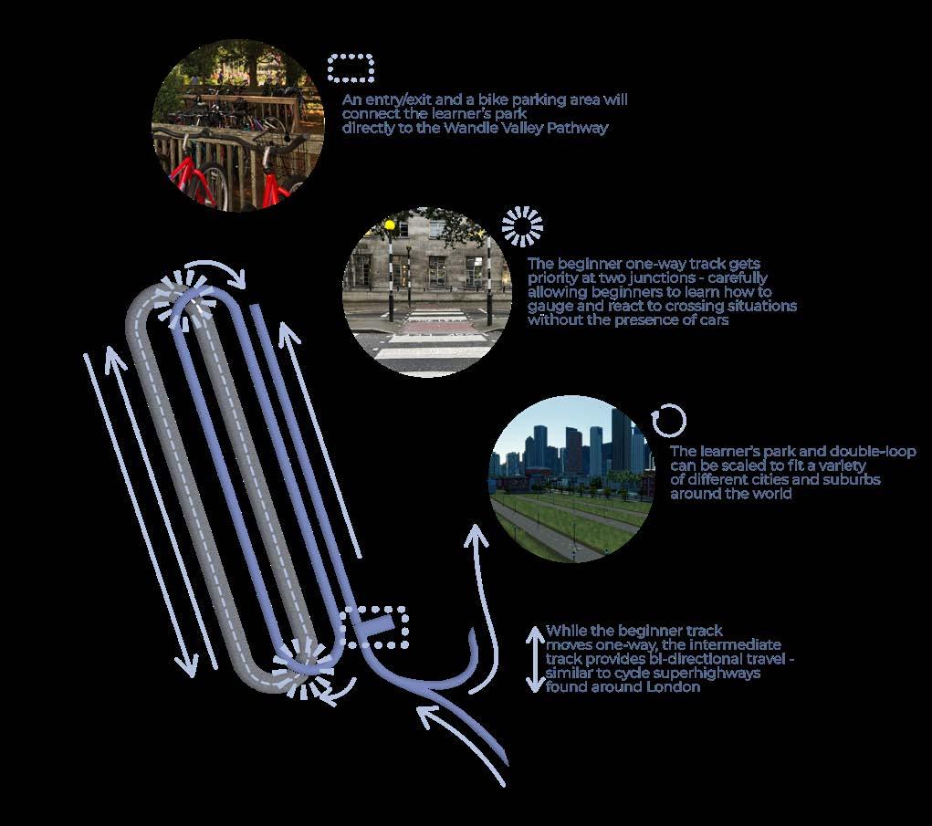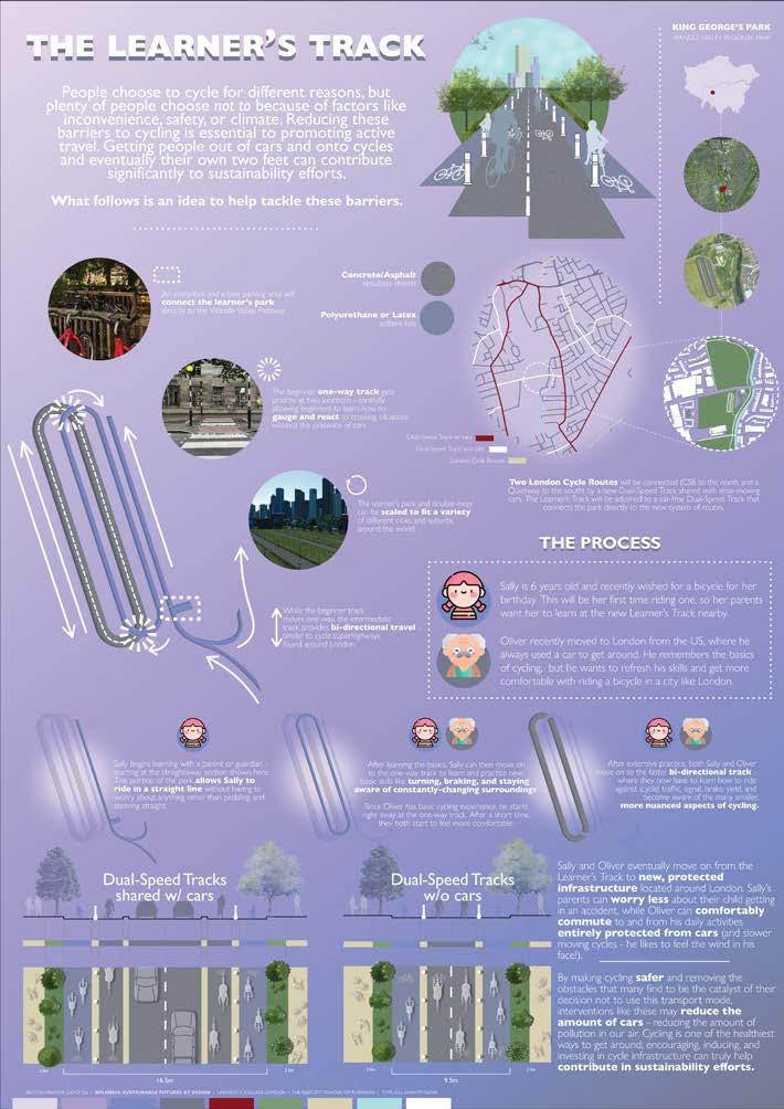 Through this individual project, I addressed some of the barriers to cycling for people of all ages and abilities. I proposed a “Learner’s Track” for King George’s Park in Wandsworth, where young and old alike can safely practice their cycling skills. Forgiving, traffic-free cycle paths connect to the track and integrate with already existing cycle routes around London.