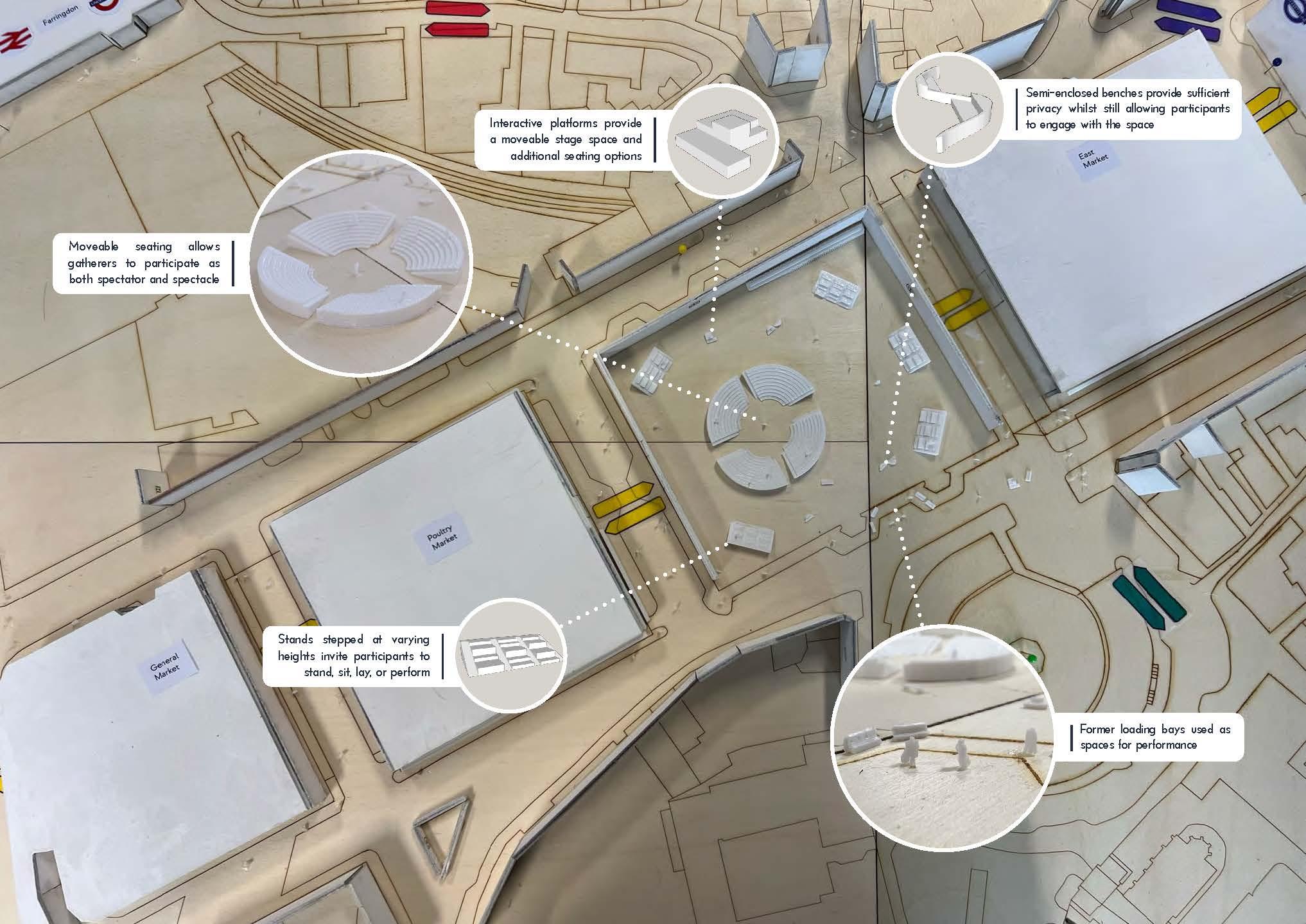 This two-person project centred around an urban design intervention for Smithfield Market. Our model incorporated stalls to activate the exterior while promoting a flexible, open, and dynamic interior accompanied by moveable furniture. Model furniture was 3D printed using UP Studio and model base and buildings were made with Fusion 360 for laser cutting. Visualisation created using SketchUp, Illustrator, and Photoshop. Tasks were shared equally between the two of us and presented to students and professionals.