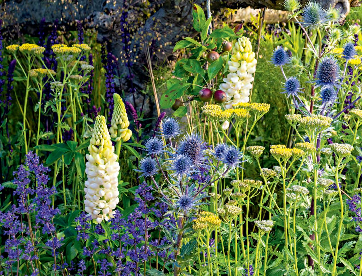 Whitelupinspires,blue eryngiumglobesand the flatheadsofachilleas jostleharmoniouslyin thissummerborder