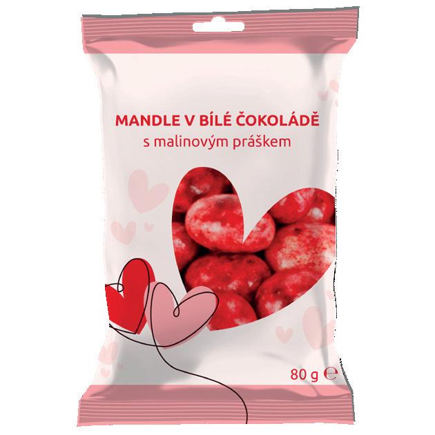 • Užijte si romantickou chvilku s mandlemi v bílé čokoládě s práškem z mrazem sušených malin.