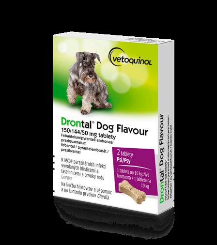 Veterinární léčivý přípravek je vydáván bez předpisu. Jedna tableta obsahuje: Febantelum 150 mg, Pyrantelum 50 mg (odpovídá 144 mg pyranteli embonas), Praziquantelum 50 mg. Léčba smíšených parazitárních infekcí vyvolaných hlísticemi a tasemnicemi, pomáhá při potlačení infekcí vyvolaných prvoky Giardia u štěňat a dospělých psů. *Při koupi 1 ks veterinárního léčivého přípravku značky Drontal® a Dronspot® obdržíte navíc silikonovou misku na vodu pouze za 0,05 Kč.
