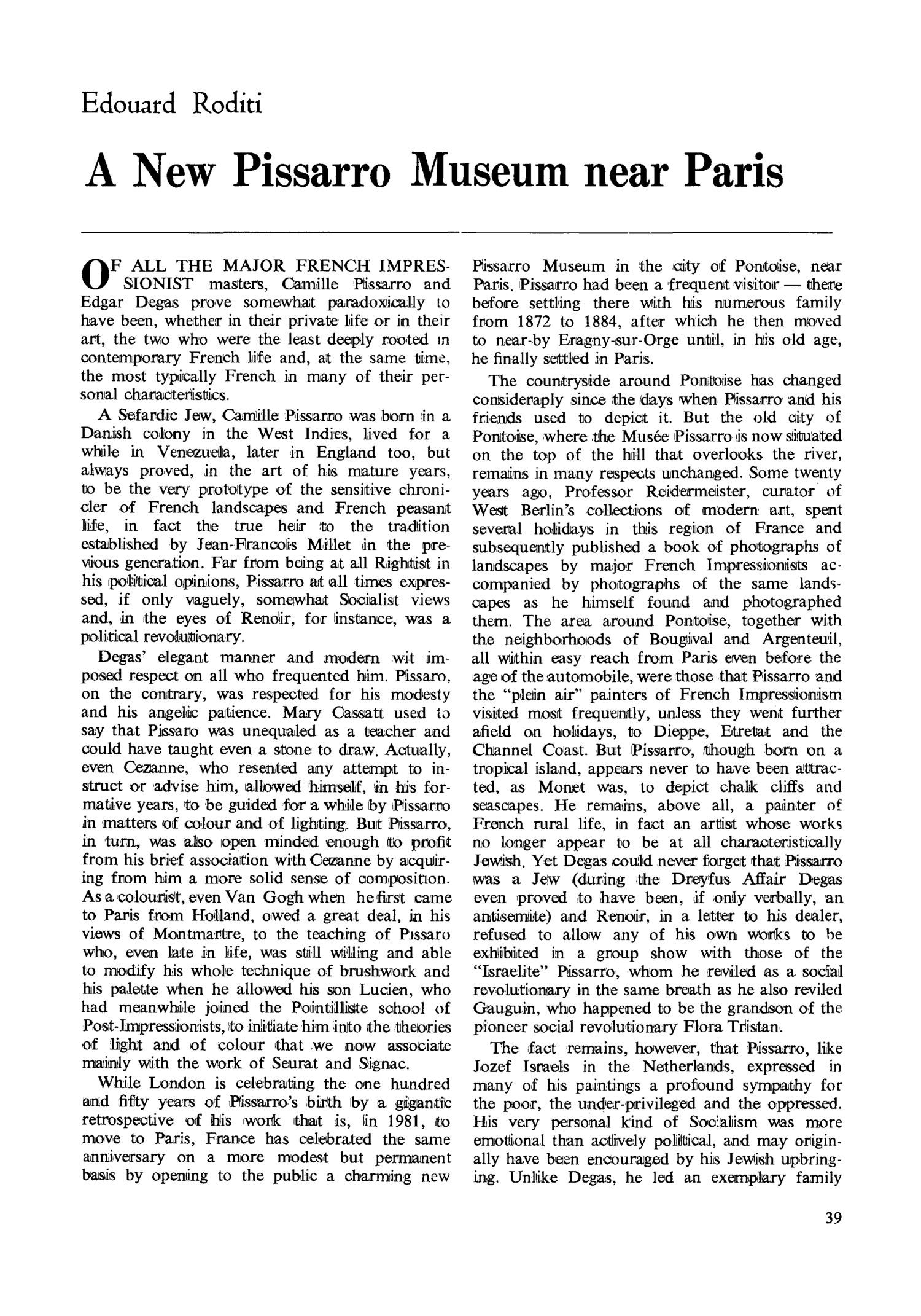 Winter 1980-81: A New Pissarro Museum Near Paris by Edouard Roditi