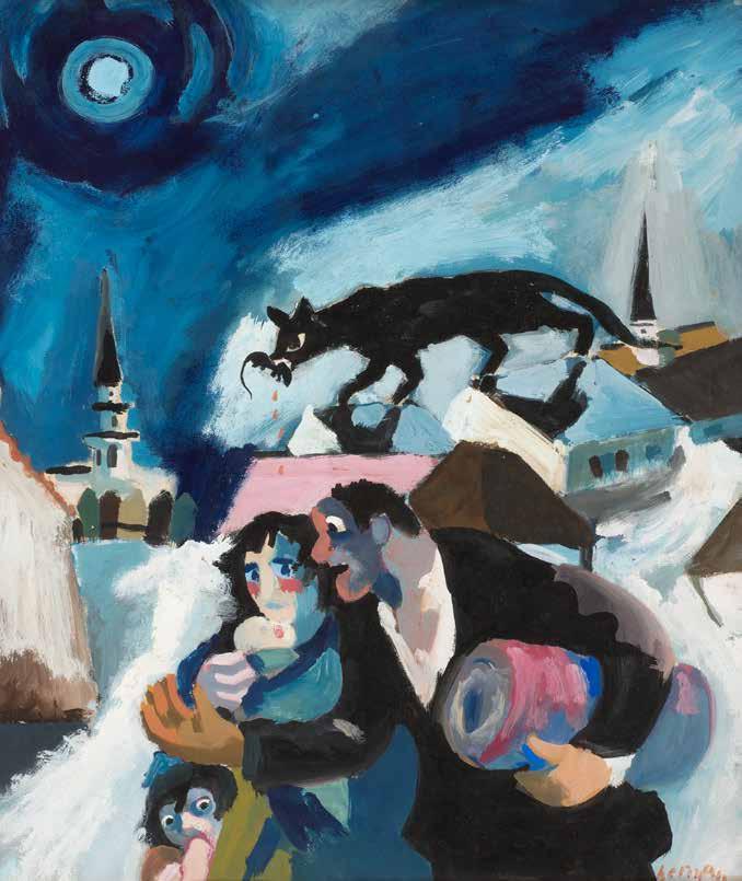 Other refugees from Nazism include German designer Elisabeth Tomalin, whose boldly coloured head, inspired by tribal masks and enamels, dates from her early studies at Berlin’s Reiman Schule, while Viennese émigrée MarieLouise von Motesiczky’s dramatically lit Circus composition demonstrates the looser, freer brushwork and softer, less angular style she developed in Britain after the war.