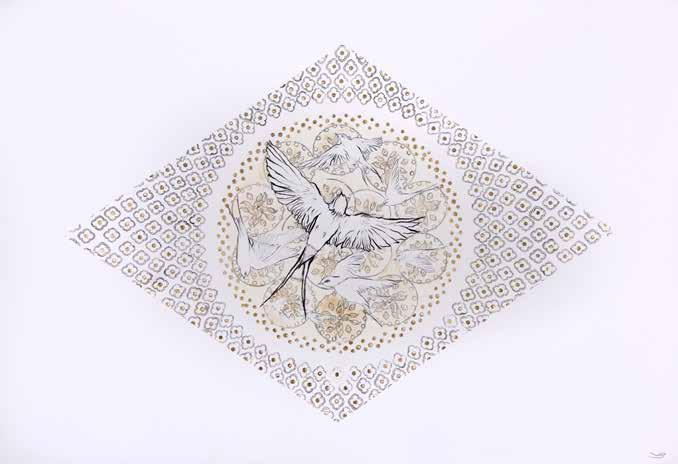 Two contemporary artists commissioned by Ben Uri highlight universal issues around experiences of displacement, exploitation, gender oppression and breaches in human rights. Iranian-born Zory Shahrokhi’s drawing, Revolution Street 2 , commissioned in 2018, depicts a swallow – a worldwide symbol of freedom and migration – contained within a diamond-shaped textile suggesting a headscarf. It commemorates ‘the Girls of Enghelab (Revolution) Street’ movement that started in Tehran after a woman removed her headscarf in protest against the compulsory wearing of the hijab.