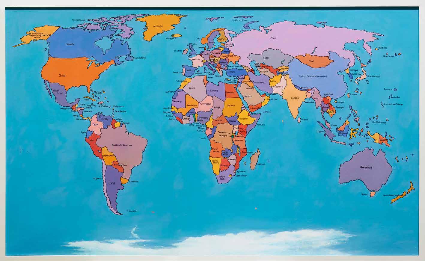 Dominican-born artist Tam Joseph, who migrated to England in 1955 at the age of eight, highlights the arbitrariness of national identities in his witty, prescient The Hand Made Map of the World, in which he playfully reorders conventional geographies, blurring boundaries and suggesting new and unexpected possibilities for the world political map.