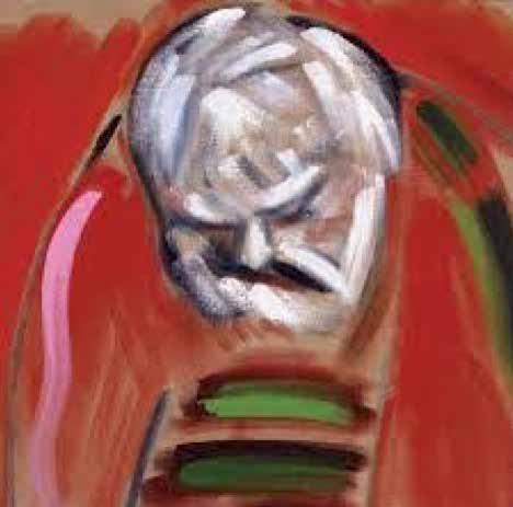 Kossoff, and himself. Kossoff’s fluent and heavily delineated dark, charcoal portrait of Romanian refugee Sonia Husid, known by her nom de plume N. M. Seedo, conveys her strength through suffering. In contrast, Kitaj’s late selfportrait employs a hot palette and his favoured square format in reworking a detail from Masaccio’s Florentine fresco The Tribute Money (c. 1425).