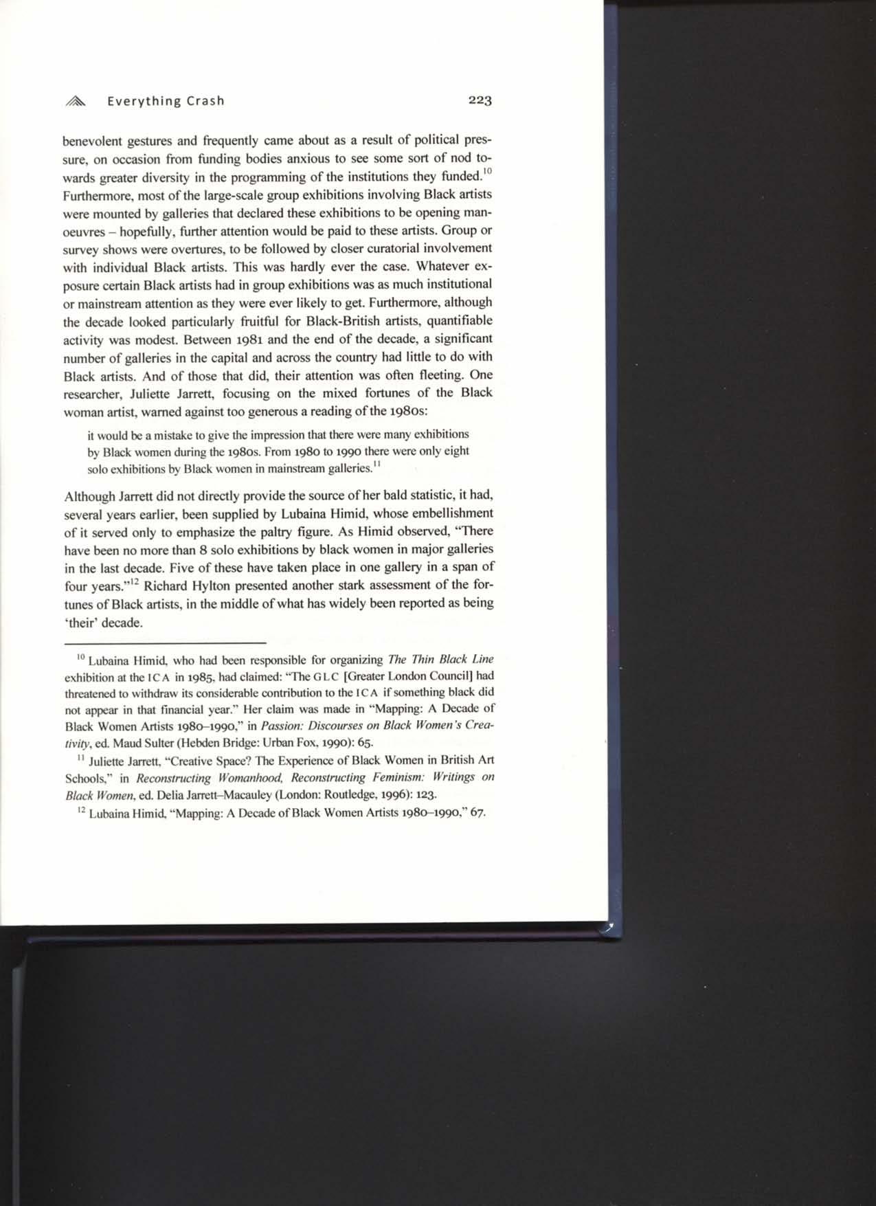 Although Jarrett did not directly provide the source of her bald stafistic, it had, several years earlier, been supplied by Lubaina Himid, whose embellishment of it served only to emphasize the paltry figure. As Himid observed, "There have been no more than 8 solo exhibitions by black women in major galleries in the last decade Five of these have taken place in one gallery in a span of four years."'' Richard Hylton presented another stark assessment of the fortunes of Black artists, in the middle of what has widely been reported as being 'their' decade