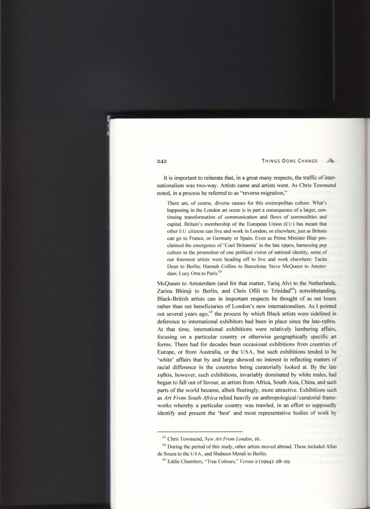 It was at this moment that the art world began to take increased notice of biennales and mega-exhlbitions across the world beyond the established and long-recognized ones, such as Venice and Documenta Particularly important in this regard were the Istanbul Biennial and the Cairo Biennale, both established in the mid-1980s, and the Johannesburg Biennale, which took place twice in the 1990s. In addition to presenting intemational group exhibitions of work by artists from several different countries, the British art world began to stage increased numbers of solo exhibitions by such artists With even the most unassuming and provincial of gallery spaces in Britain seeking to avail themselves of this latter-day intemationalism, all but the most favoured Black artists found their chances of substantial gallery attention shrinking even further, asmore and more galleries sought to intemationalize their curatorial programmes, as a nod towards cosmopolitanism and diversity The coterie of freshly minted intemational curators emerging in the 1990s were interested in few Black-British artists beyond such already familiar names as Bhimji, Julien, Locke, McQueen, Ofili, and Shonibare. This limited horizon extended to similarly limited numbers of familiar names of favoured artists drawn from other countries Thus, in biennales, biennials, and other mega-exhibitions it was possible for international audiences to see the same sorts of work, from the same sorts of artists, time and again In this regard, the artists mentioned above were clear beneficiaries of these shifts in international cultural politics, away from what were regarded as worthy but dull approaches to art and politics: "the world of visual arts has realized that hybridity allows a release from dreary identiry politics work and has embraced Ofili with open arms." *