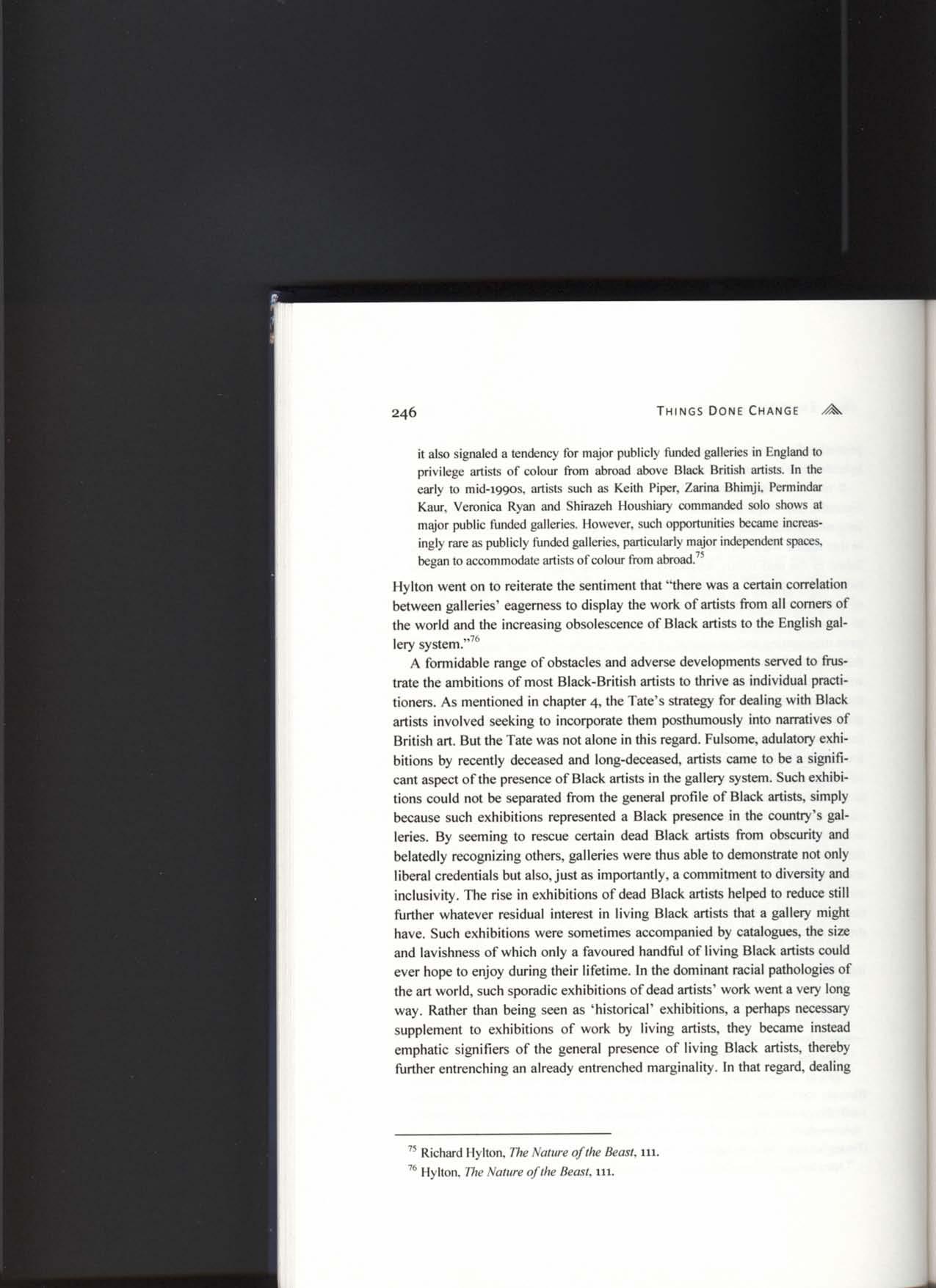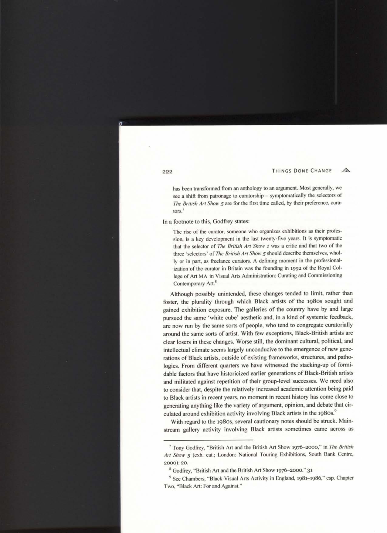 Although possibly unintended, these changes tended to limit, rather than foster, the plurality through which Black artists of the 1980s sought and gained exhibition exposure The galleries of the country have by and large pursued the same 'white cube' aesthetic and, in a kind of systemic feedback, are now run by the same sorts of people, who tend to congregate curatorially around the same sorts of artist With few exceptions, Black-British artists are clear losers in these changes. Worse still, the dominant cultural, political, and intellectual climate seems largely unconducive to the emergence of new generations of Black artists, outside of existing ftrameworks, structures, and pathologies From different quarters we have witnessed the stacking-up of formidable factors that have historicized earlier generations of Black-British artists and militated against repefition of their group-level successes. We need also to consider that, despite the relafively increased academic attention being paid to Black artists in recent years, no moment in recent history has come close to generating anything like the variety of argument, opinion, and debate that circulated around exhibition acfivity involving Black artists in the 1980s.'