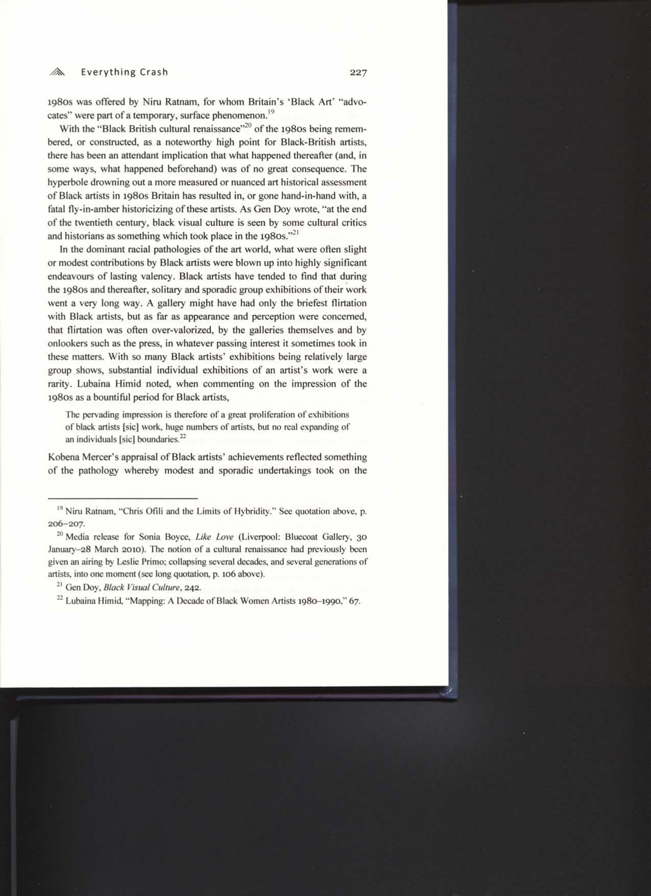 With the "Black British cultural renaissance"""* of the 1980s being remembered, or constructed, as a noteworthy high point for Black-British artists, there has been an attendant implication that what happened thereafter (and, in some ways, what happened beforehand) was of no great consequence The hyperbole drowning out a more measured or nuanced art historical assessment of Black artists in 1980s Britain has resulted in, or gone hand-in-hand with, a fatal fly-in-amber historicizing of these artists As Gen Doy wrote, "at the end of the twenfieth century, black visual culture is seen by some cultural crifics and historians as something which took place in the 1980s.""'
