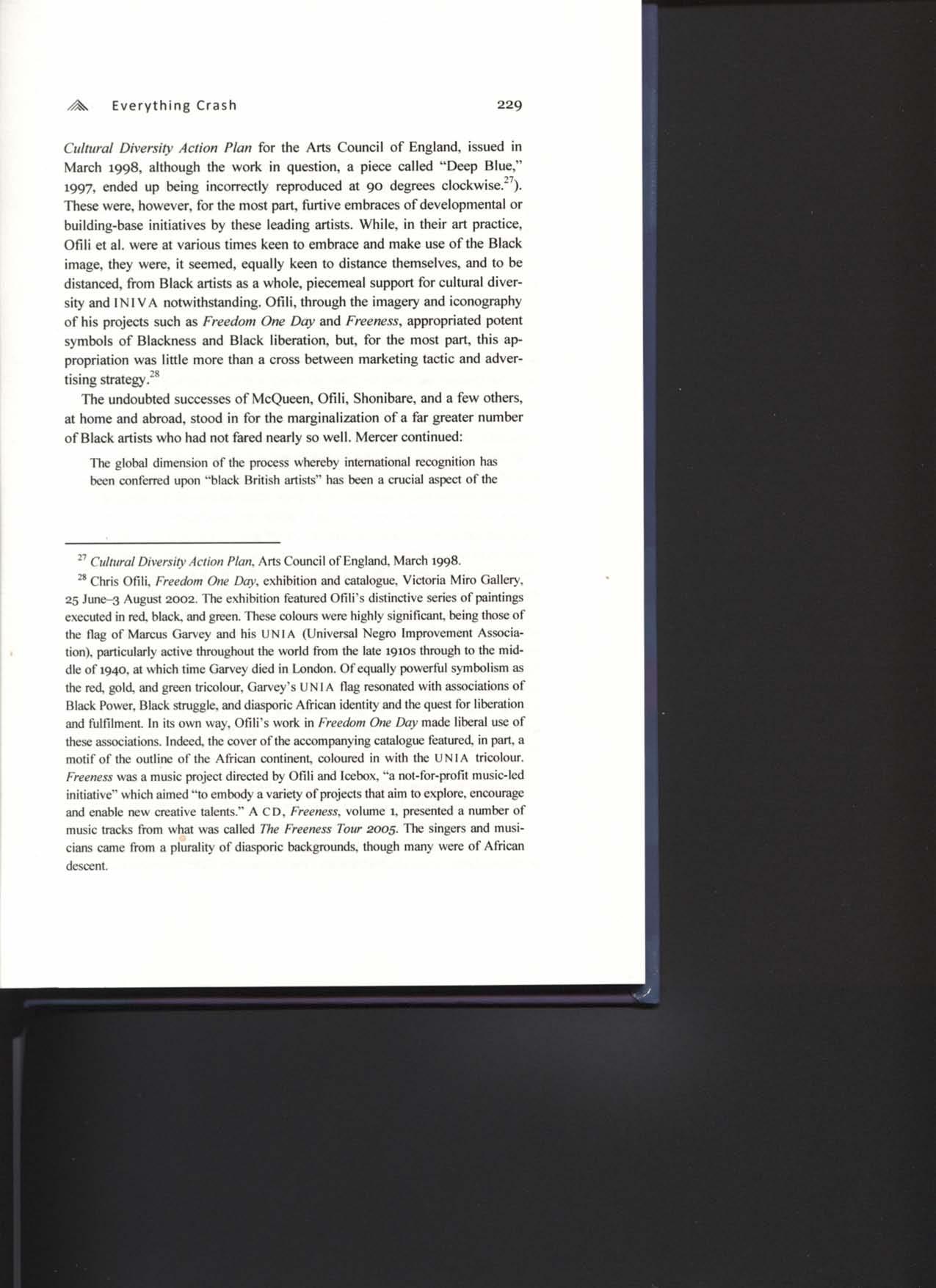Cultural Diversity Action Plan for the Arts Council of England, issued in March 1998, although the work in question, a piece called "Deep Blue," 1997, ended up being incon-ectly reproduced at 90 degrees clockwise ) These were, however, for the most part, furtive embraces of developmental or building-base initiatives by these leading artists While, in their art practice, Ofili et al were at various times keen to embrace and make use of the Black image, they were, it seemed, equally keen to distance themselves, and to be distanced, from Black artists as a whole, piecemeal support for cultural diversity and INIVA notwithstanding Ofili, through the imagery and iconography of his projects such as Freedom One Day and Freeness, appropriated potent symbols of Blackness and Black liherafion, but, for the most part, this appropriation was little more than a cross between marketing tactic and advertising strategy."