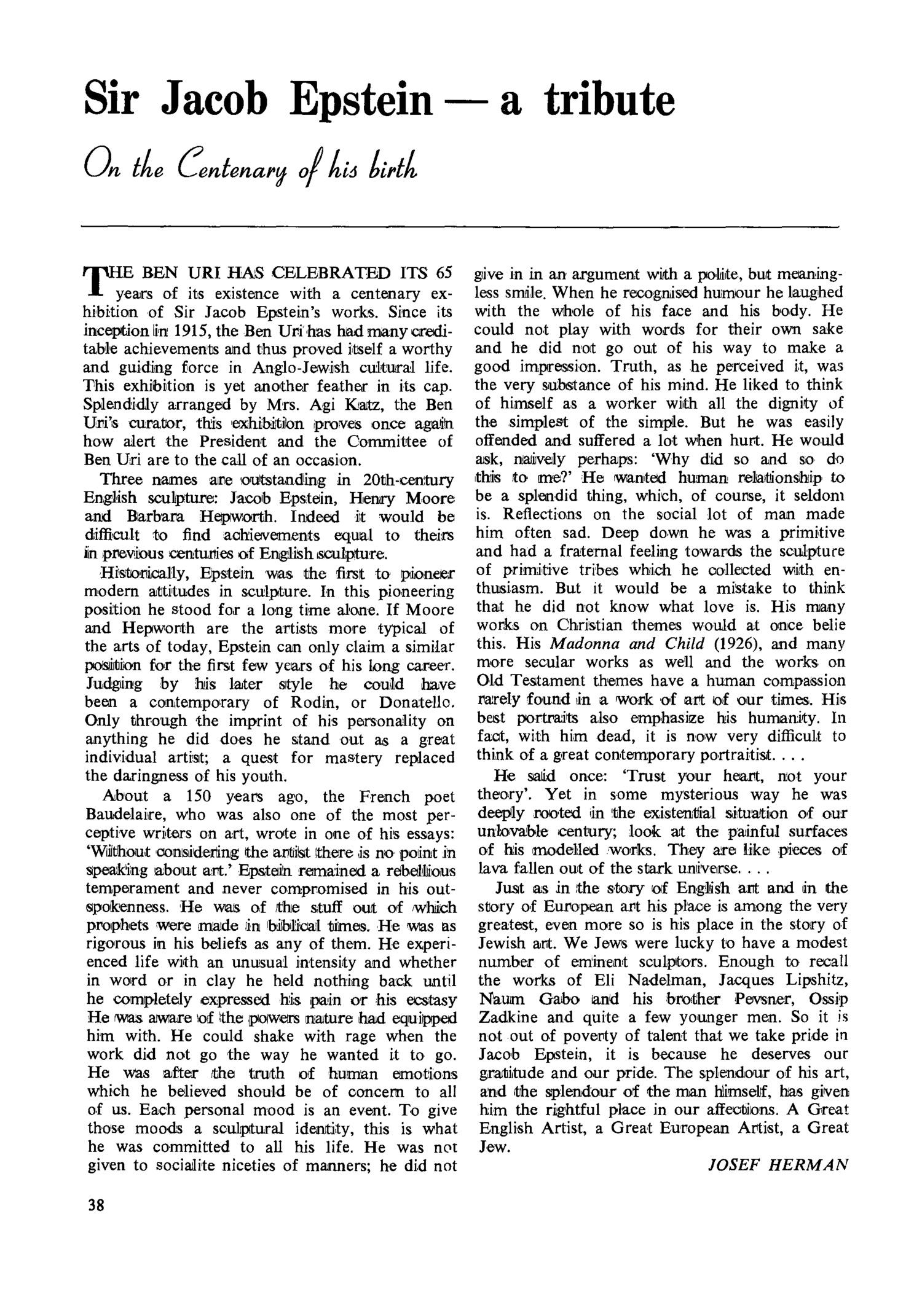 SIR JACOB EPSTEIN A TRIBUTE
