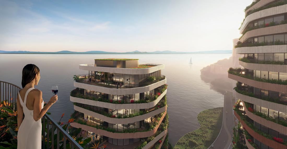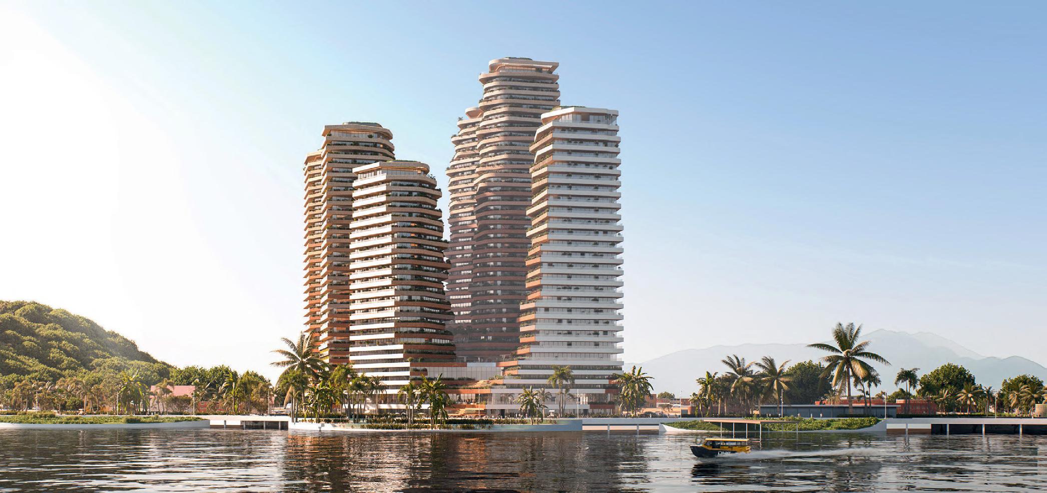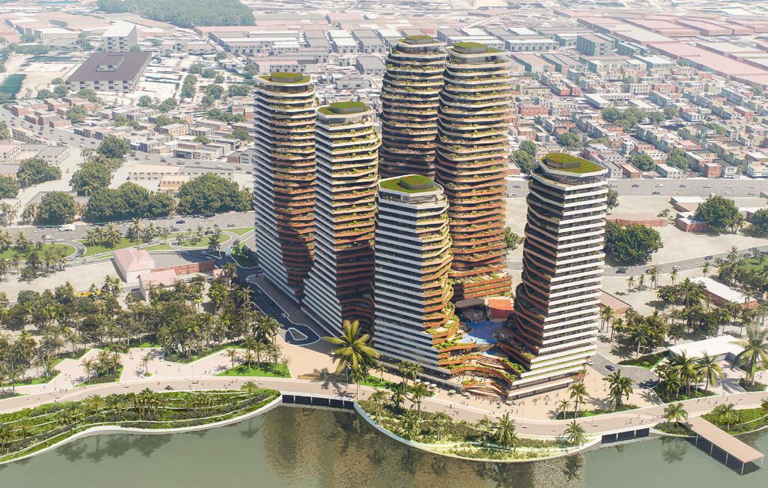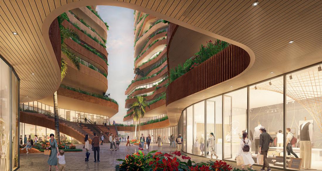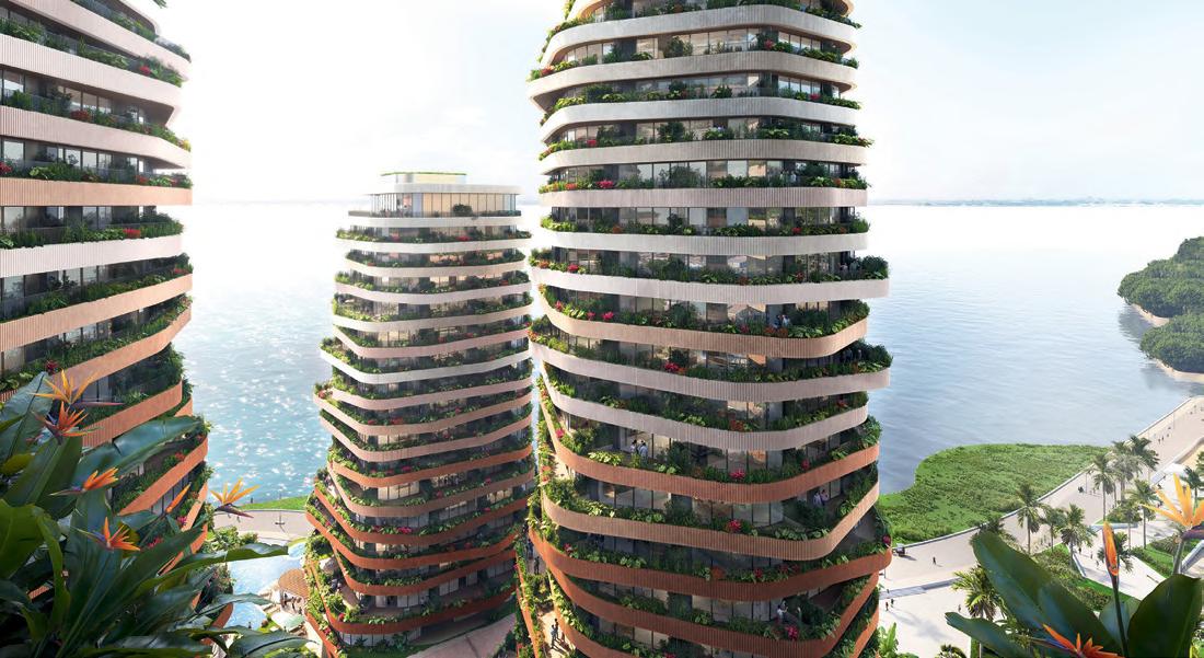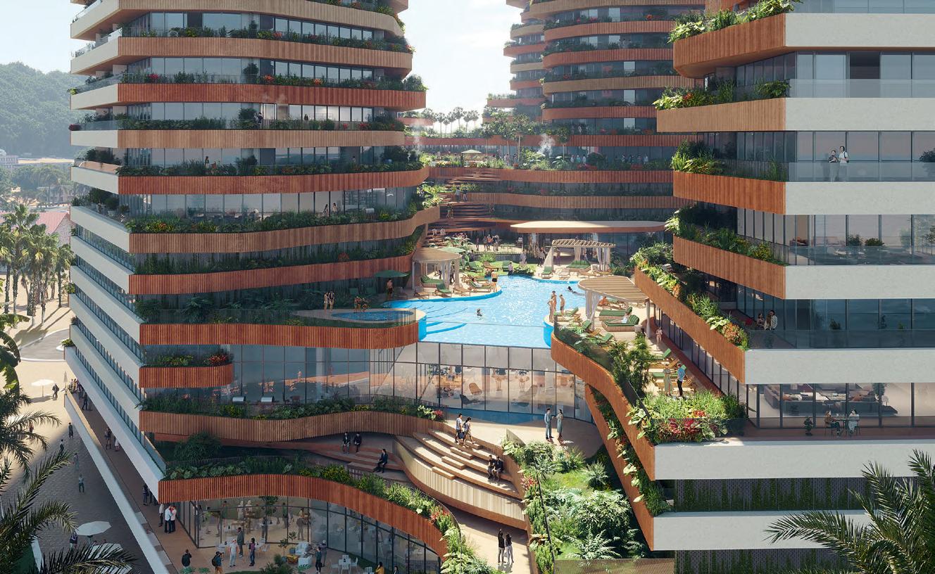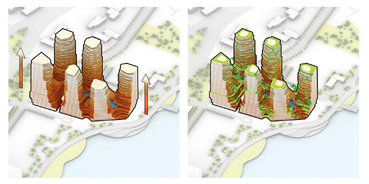 At the base of the project, the towers merge together to form a terraced green valley that contains an oasis of pools, sports fields and a large urban amphitheatre facing the riverfront, all surrounded by lush, natural vegetation. Inside this base are shops, a large community clubhouse, and other amenities.