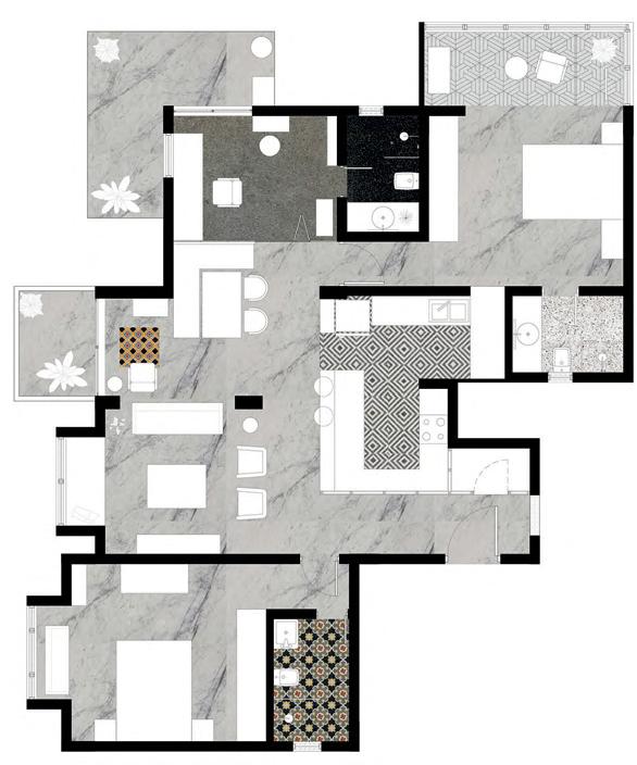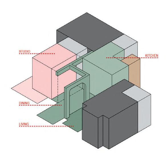 ARCHITECTURE+DESIGN August 2022 83 BEFORE THE INITIAL PLAN WAS SPACIOUS HOWEVER IT WAS COMPARTMENTALISED AND DID NOT HAVE AN UNOBSTRUCTED FLOW OF SPACES, THUS MAKING IT DIMLY LIT. OPENING UP THE EXISTING KITCHEN COMPLETELY HELPED TO BRING IN NATURAL LIGHT FROM THE SMALL BALCONY CONNECTED TO THE LIVING SPACE.