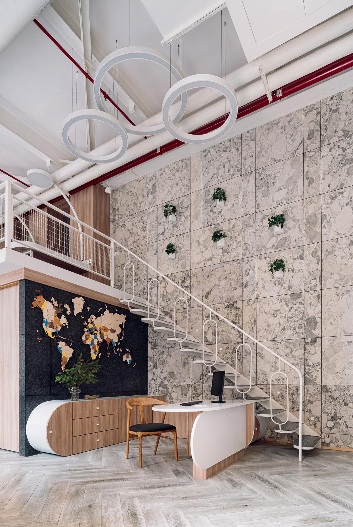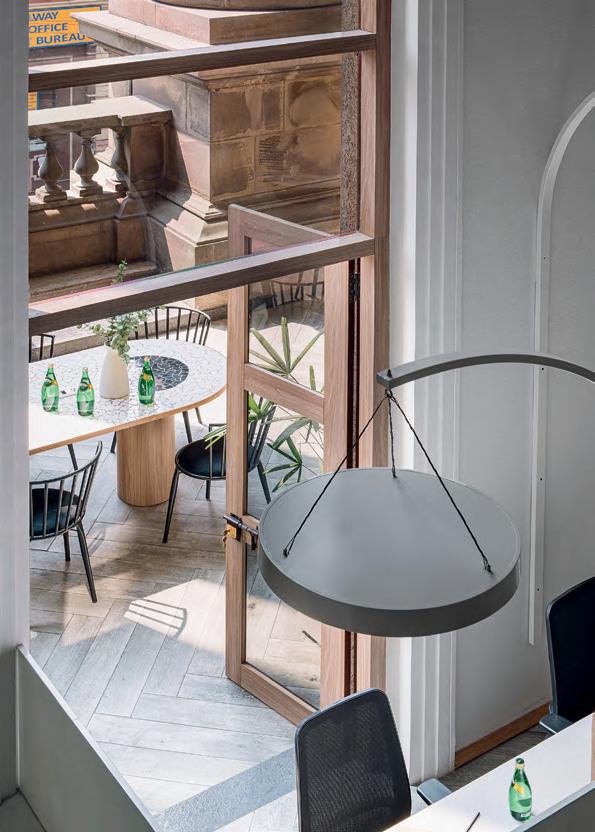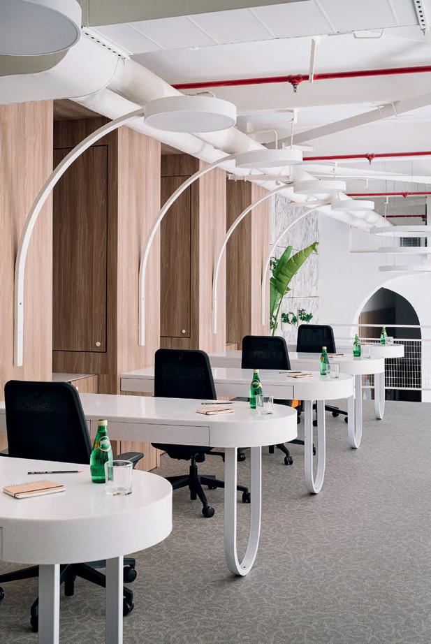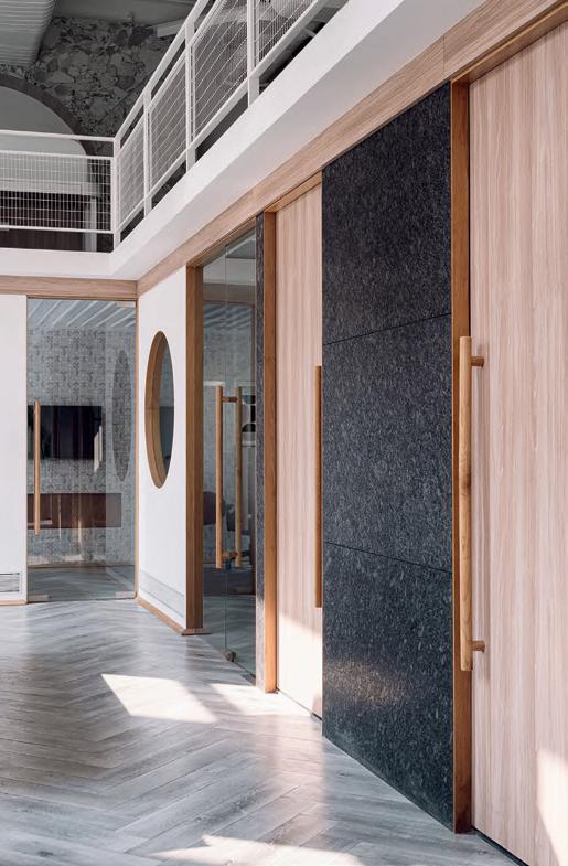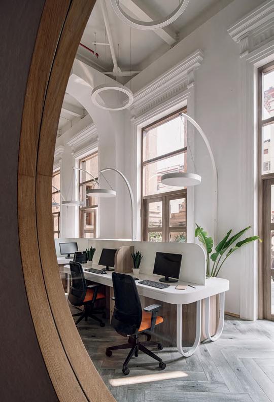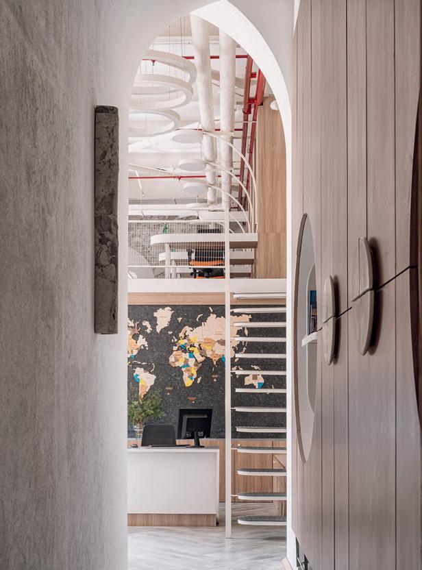 While the o ce has an area of 2200sq ft, it o ers heights of 20ft on the premises and over 39ft on the terrace. The o ce has a portal-like passage leading up to the entrance. Two distinct half arcs intersect at the entry where the passage meets the main reception area, o ering an enchanting view of the double-height space. The reception and the waiting area have a world map installation as the backdrop– complementing the Nordic-Scandinavian look of the space. As much as the o ce is su used with Scandinavian design themes, it was also crucial to maintain the historical character of POOJA BIHANI, Founder and Principal Architect, Spaces & Design