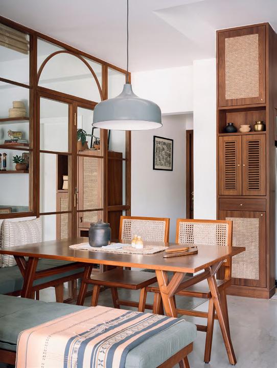 a teak wood and glass partition, with folding doors. Creating an open living plan, filled up the space with ample natural light and also created a clear visual connect to the greenery outside at all times when in the living, dining and kitchen.