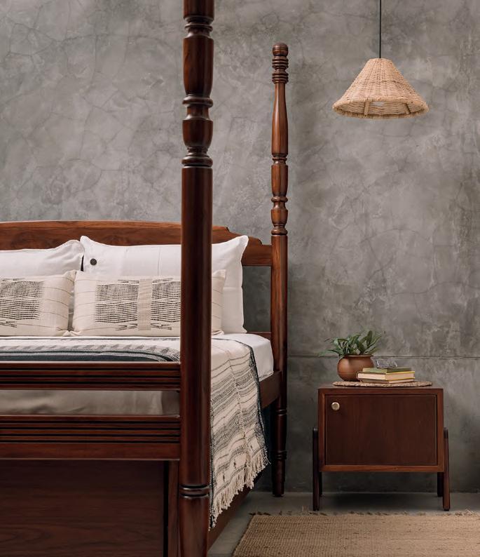 While we have our popular picks like the Uru, Aronui and Patahi chairs, the Tidlos sofa or the Boyali table, we like to keep reinventing the wheel. As a result, our latest collections often amalgamate the best of the old and new. What is the material palette like? We have always supported the ‘go vocal for local’ cause, and we mostly work with native materials, such as local Indian wood like teak. However, we also use imported wood like White Oak depending on the piece, design and client requirement. Who designs the furniture? The furniture at Alankaram coalesces traditional with contemporary design and is the creative result of two generations working together—my mother and I. While most of the furniture is designed by me, my mother spearheads all the artwork on the furniture and hand-painted fabrics. She gives the finishing and artistic touches to vernacular pieces. My work is highly inspired by Danish designer H. Wegner and his minimalist design style, which is simple, yet utilitarian. It has a sleek, modern appeal with a tactile quality, while being rooted in timeless tradition. Tell us about the latest collection. Our latest collection is Kudrat, which means ‘nature’ in Sanskrit, an ensemble showcasing the rattan weave’s beauty. Our popular bed design Uway makes a comeback with the Kudrat collection. This time, we are offering it with a unique new headboard design, featuring rattan and grey upholstered fabric. The same frame design is seen in its coordinated Cist trunk. The Maly bedside unit completes the trio with similar rattan accents and the iconic indigo-blue natural teak finish. Since no collection is complete without a relaxing armchair, the featured set includes the Toso armchair with a matching footstool that carries forward the design language of blue teak wood visible throughout the collection.