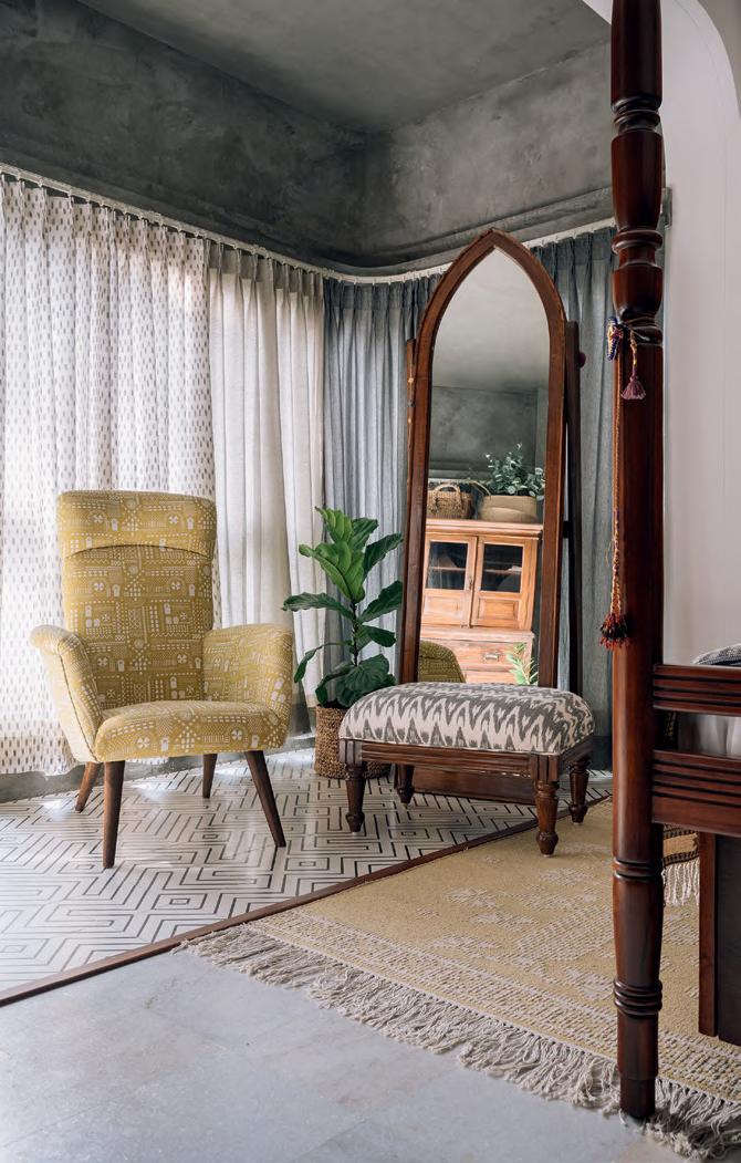 The Master Bedroom opens out to fabulous views of the fields and the Aravalli range. The muted colours, the gorgeous mix of prints and patterns, and an excellent curation of furniture and accents add to the allure of the space.