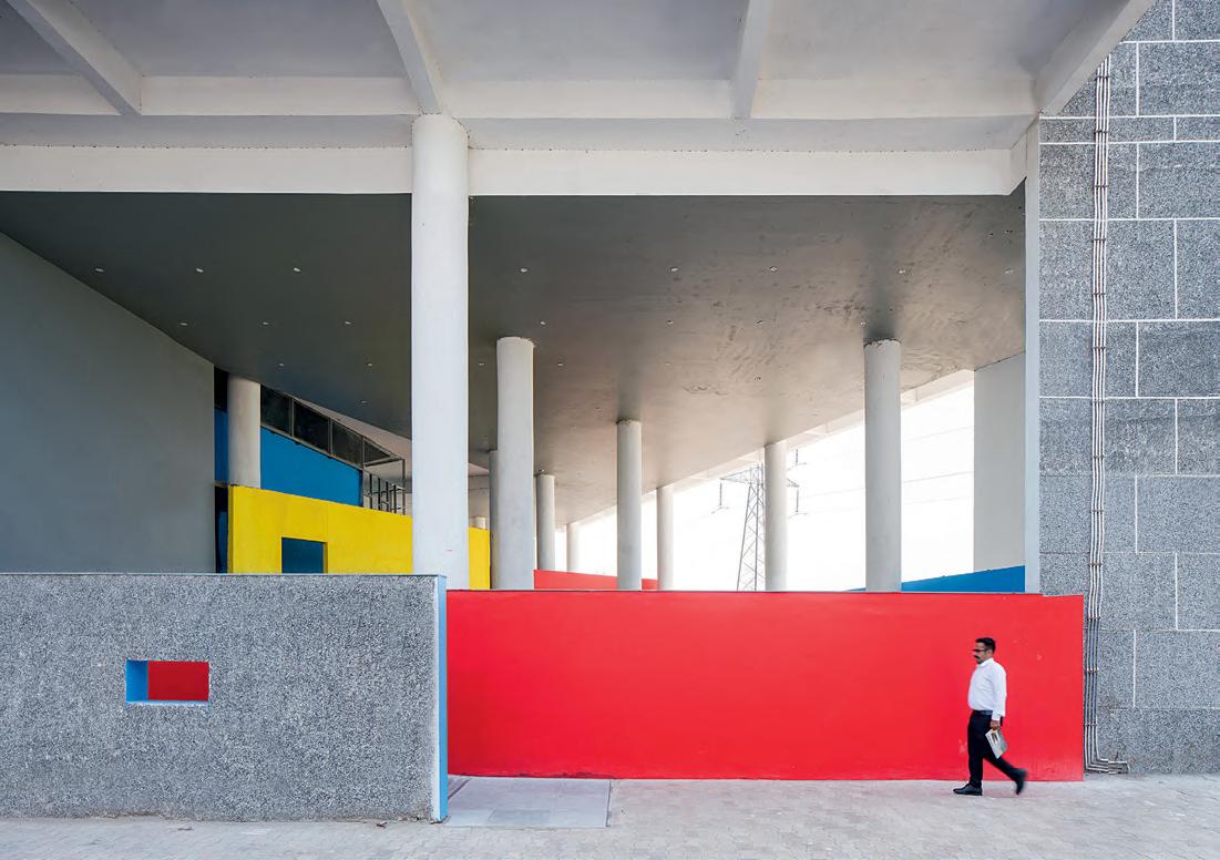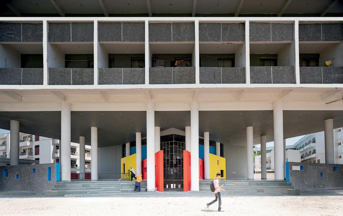 The student hostel, located within a 25-acre campus in Landran, a semi-urban area close to Mohali, draws from Le Corbusier’s modernist legacy. The 10-storey building occupies the campus’ bus yard in place of designing on the proposed greenfi eld site. A simple triangular plan makes the most of the oddly-shaped site while playing with levels to create multiple interactive volumes.