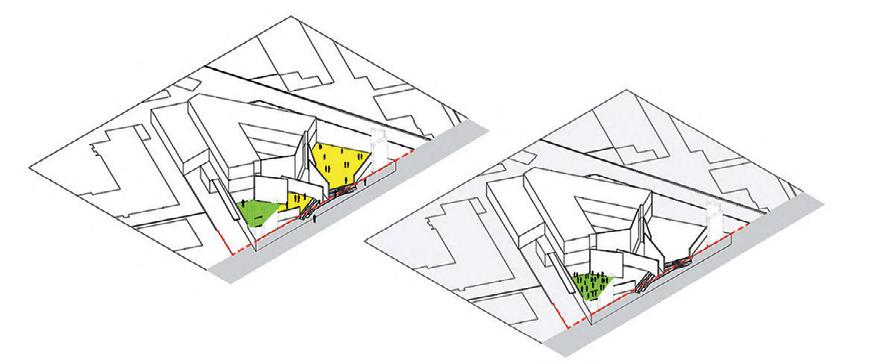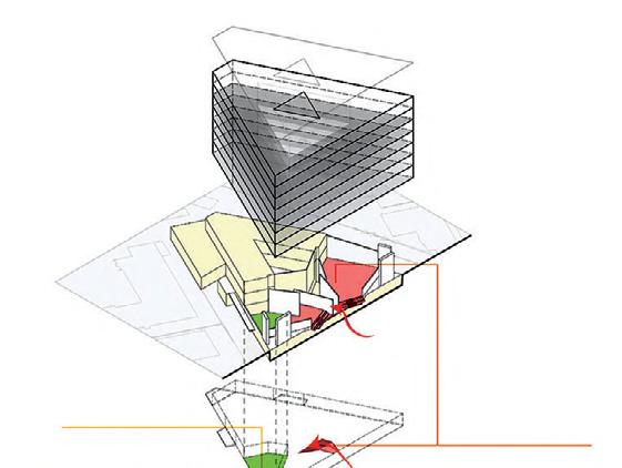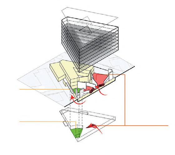 The primary idea was to step away from the enclosed vocabulary of the existing campus buildings by freeing the new building of boundary walls, in an attempt to create shaded recreational spaces. This idea manifests in the form of a triple-height, sunken public court situated at the core of the hostel’s basement, which can be accessed by a wide fl ight of steps leading down from the approach road. The court shapes a central atrium intersected by bridges at multiple levels and terminating in large skylights. The lower fl oors, including the sunken court, are open to public access during the day, and to the hostel occupants after closing hours. TV rooms with individual sunken courts, a gym, a multipurpose hall and other ancillary facilities are arranged around the main courtyard.