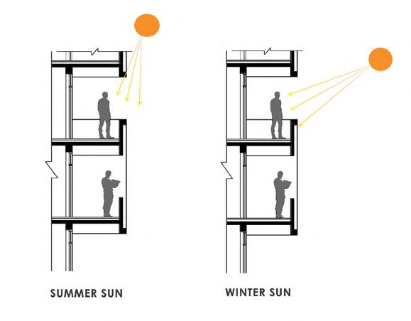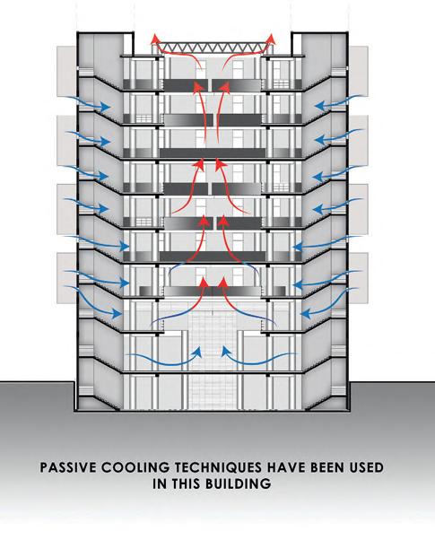The ground level houses the reception, the dining area and an adjoining kitchen, while a reading room, administration spaces and the warden’s room make up the fi rst fl oor. The sky-lit atrium is fl anked by student accommodation spaces on the fl oors above, with the bridges creating spill-over spaces as well as ensuring seamless circulation between corridors. A covered balcony is attached to each room, with a grey grit fi nish over the building envelope to ensure that the built fabric sits in harmony with the other buildings on the campus.