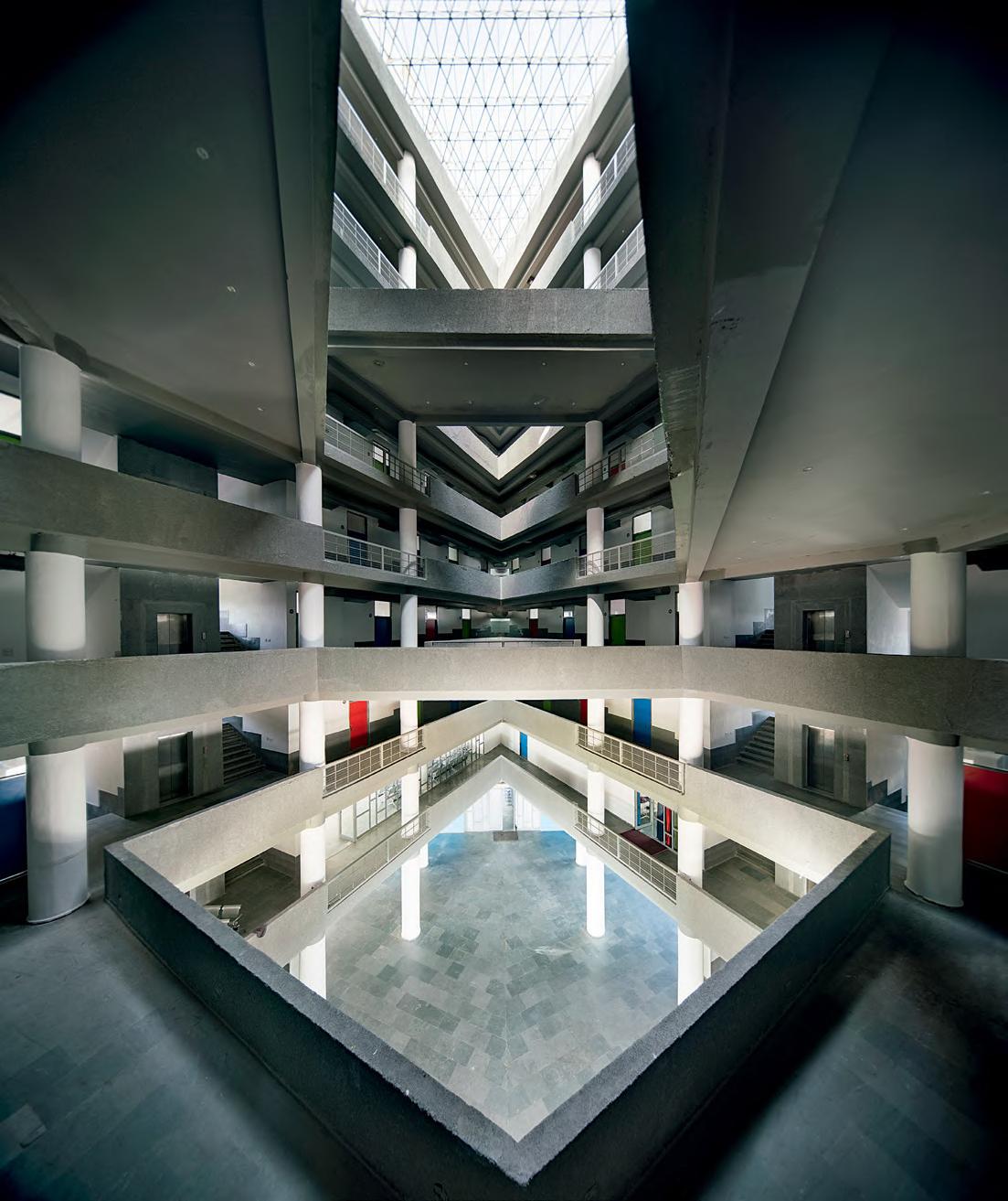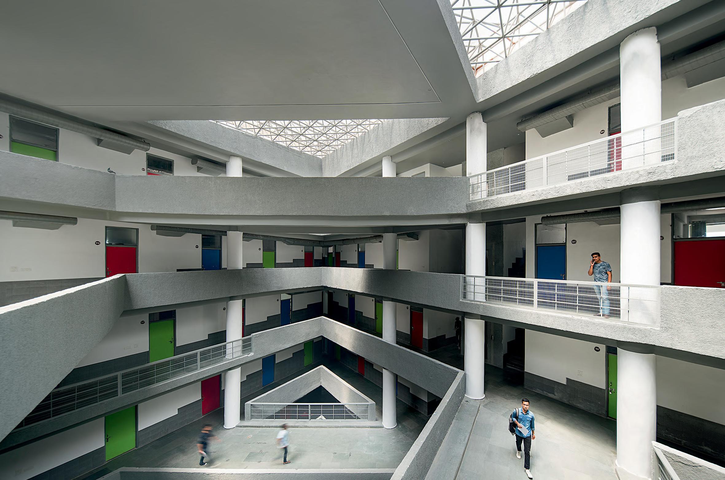 The project designed by Charged Voids is infl uenced by Le Corbusier’s modernist legacy and fi nds expression in the sky-lit corridors of the hostel.