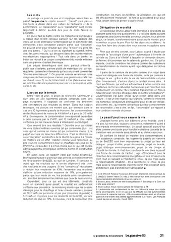 L’habitant forme avec son bâtiment un tel hybride, dont il n’a pas, lui non plus, toujours conscience, notamment quant à ses impacts environnementaux. Le passif apparaît aujourd’hui alors comme une bouée pour franchir les traitres courants de la transition vers un monde sans pétrole et au climat capricieux. En confiant ce travail de maitrise des consommations à leur substance construite, les logements passifs de Hanovre ou de BedZED sont bien dépositaires du projet qui leur est délégué : projet d’utilité, projet d’économie, projet de beauté, projet d’éthique environnementale, projet de vie civique et d’équité territoriale. Il n’est donc pas faux de voir dans le passif une forme de morale de l’action : agir efficacement pour la réduction des consommations énergétique et des émissions de CO2, tout en laissant à l’habitant le choix, la joie mais aussi la responsabilité d’habiter… Et à l’architecte, le choix, la joie mais aussi la responsabilité d’architecturer. Pas de passif sans architecture, pas d’architecture sans passif. ■ 1. Cost Efficient Passive Houses as EUropean Standards, www.cepheus.de 2. BedZED Seven Years On, 44p, à télécharger sur www.bioregional.com/ news-views/publications/bedzed-seven-years-on. 3. Bruno Latour, Where are the Missing Masses ? Sociology of a Door, sur le site www.ensmp.fr 4. Bruno Latour, Nous n’avons jamais été modernes, p.74. 5. L’automobile est certainement le lieu où l’influence insue des objets est la plus flagrante, si on en juge par la difficulté que les automobilistes rencontrent à respecter les lois : 85% des automobilistes sont en infraction quand ils traversent des petites agglomérations (Le Figaro, Les Français roulent de plus en plus vite, 3 août 2002).