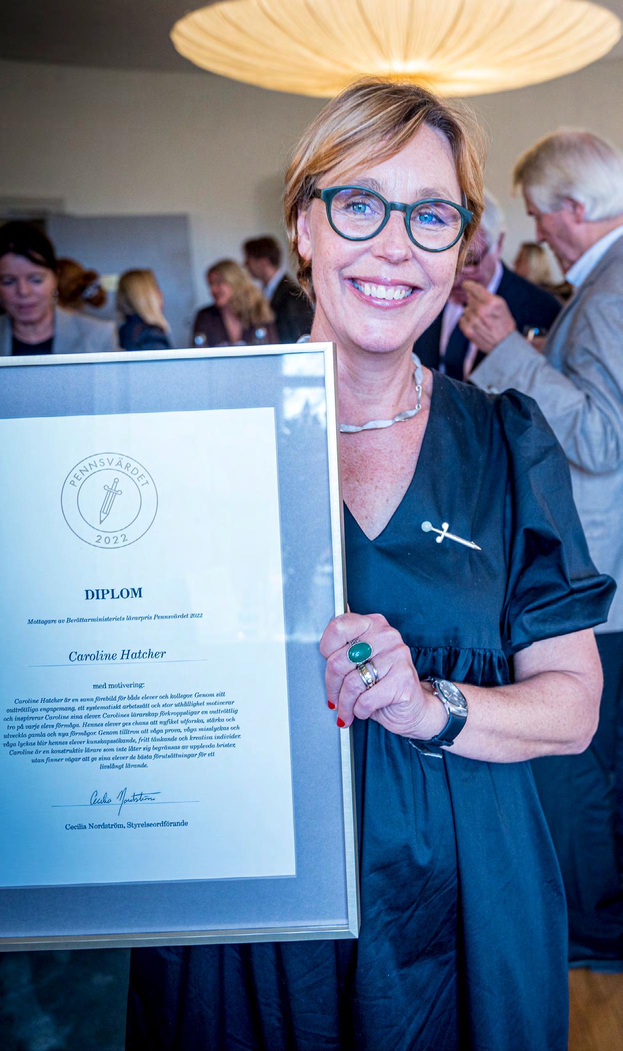 2022 års mottagare av Pennsvärdet heter Caroline Hatcher och är lärare i SO, svenska som andraspråk, svenska och engelska i årskurs 6 på Ryaskolan i Göteborg. Caroline har arbetat 27 år som lärare varav de senaste fyra på Ryaskolan.