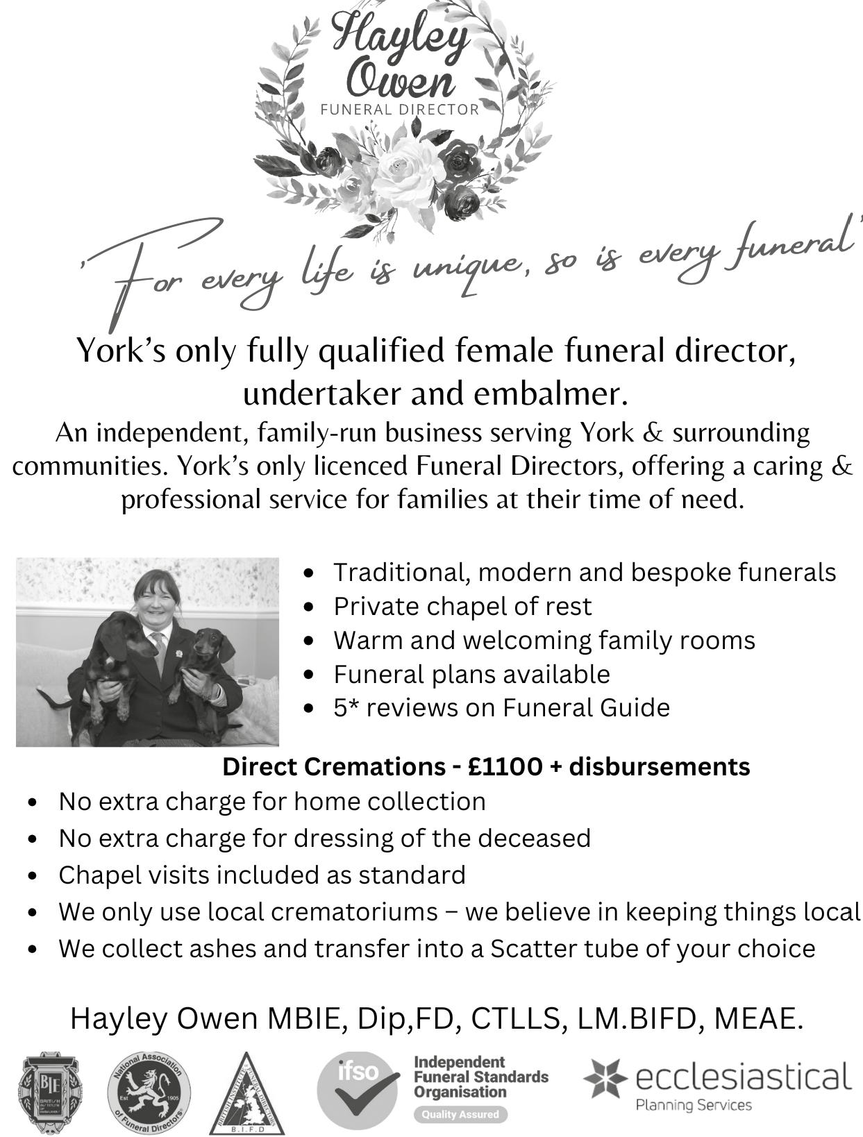 Following the death of the person of importance to you, they will be taken into the care of the mortuary team at York Hospital. They are open Monday-Friday, 8:30am-4:30pm. Viewing appointments are between Monday-Friday, 10:00am-3:30pm. Tel No. 01904 726803