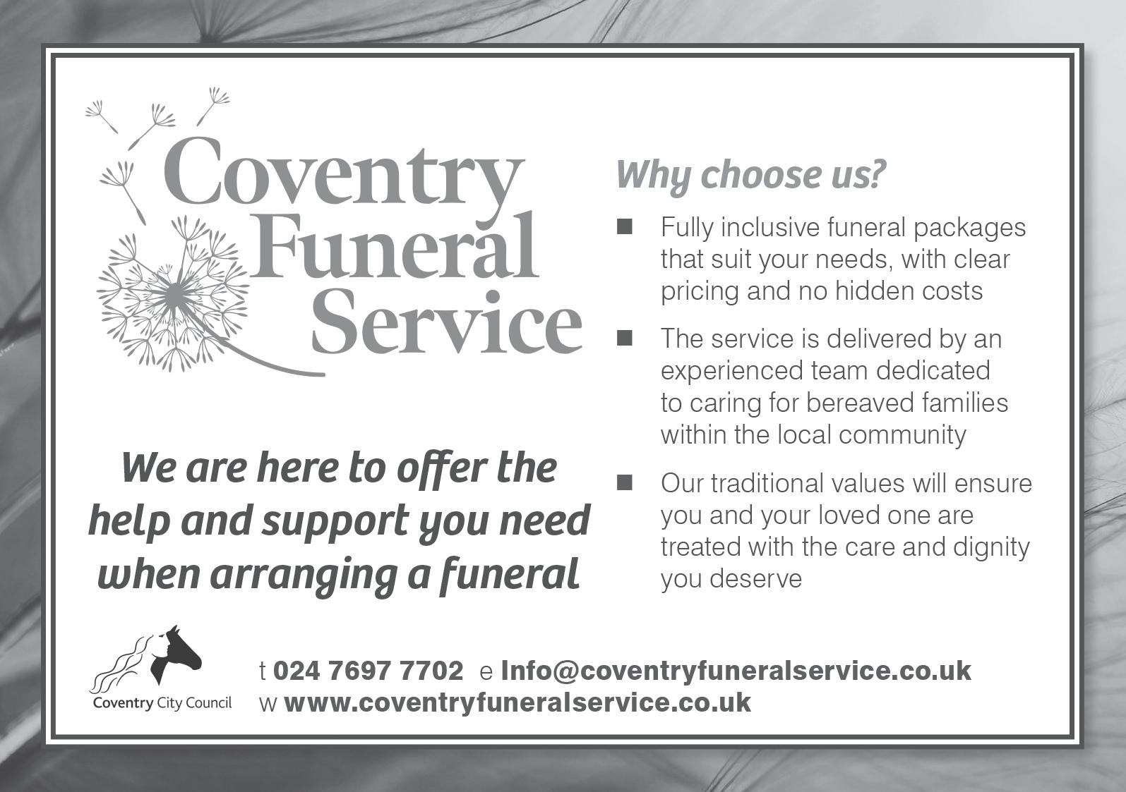 The Bereavement Office are available for help or advice by ☎ 024 7696 5834 / 5835 / 5838 on Monday to Friday 9.30am - 4.00pm.