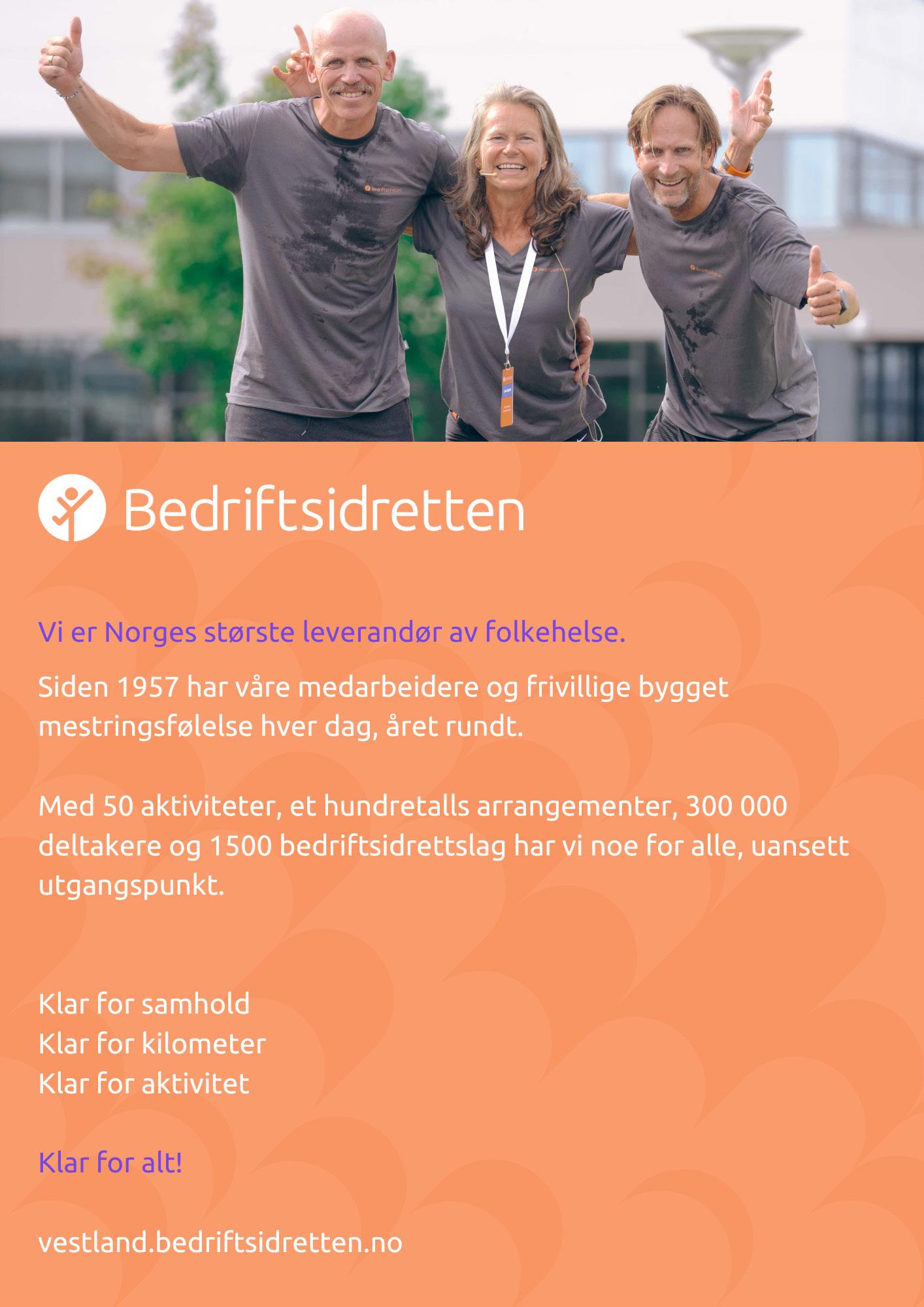 I 2023 samarbeider Bergen-Voss med Vestland Bedriftsidrettskrets. Er din bedrift med i Vestland Bedriftsidrettskrets må du registrere dette i påmeldingen. Da blir dere med å kjempe om flotte premier i bedriftskonkurransen vår. Er ikke din bedrift med i Vestland Bedriftsidrettskrets anbefaler vi at dere registrerer dere. Ta da kontakt med Vestland Bedriftsidrettskrets på vestland@bedriftsidretten.no For mer info om Vestland Bedriftsidrettskrets se her; Vestland Bedriftsidrettskrets (bedriftsidretten.no)