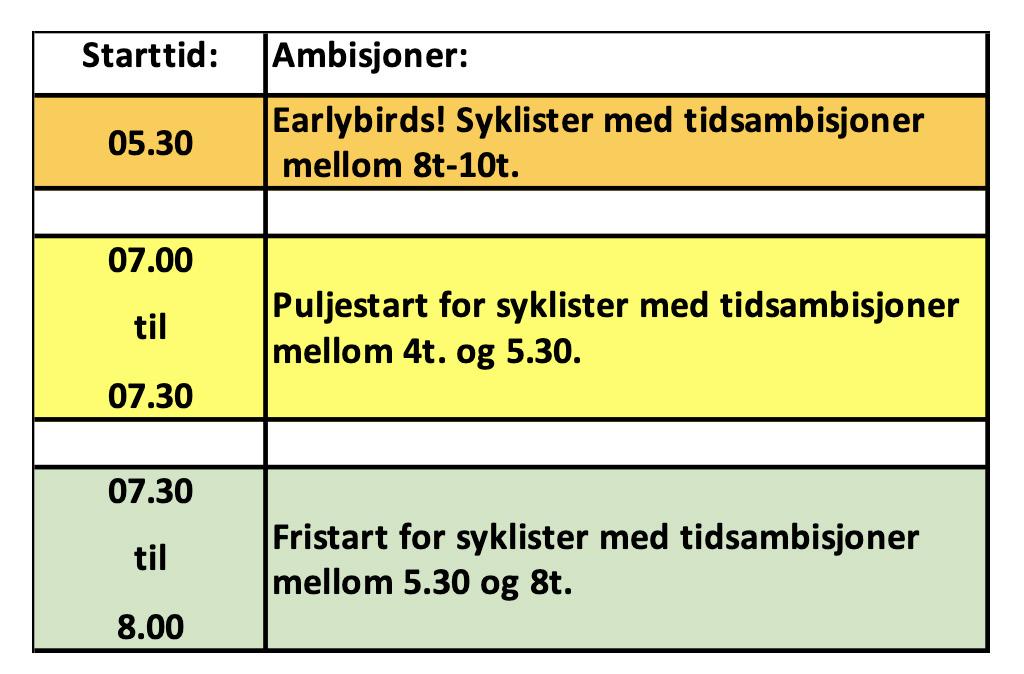 Vi ønsker at alle skal føle seg vel under vårt arrangement 3. juni. Både de som liker å sykle i felt, og de som ikke trives med dette. Derfor innfører vi fristart i andre halvdel av startavviklingen. De med tidsambisjoner mellom 4t og 5.30 vil kunne melde seg på i startpuljer som tidligere, mens de som vil bruke lengre tid, gjerne sammen med venner og kollegaer, vil kunne starte når de vil innenfor fristartperioden. Om du synes det å sykle i felt er utfordrende så vil dette oppleves både tryggere og mer sosialt!