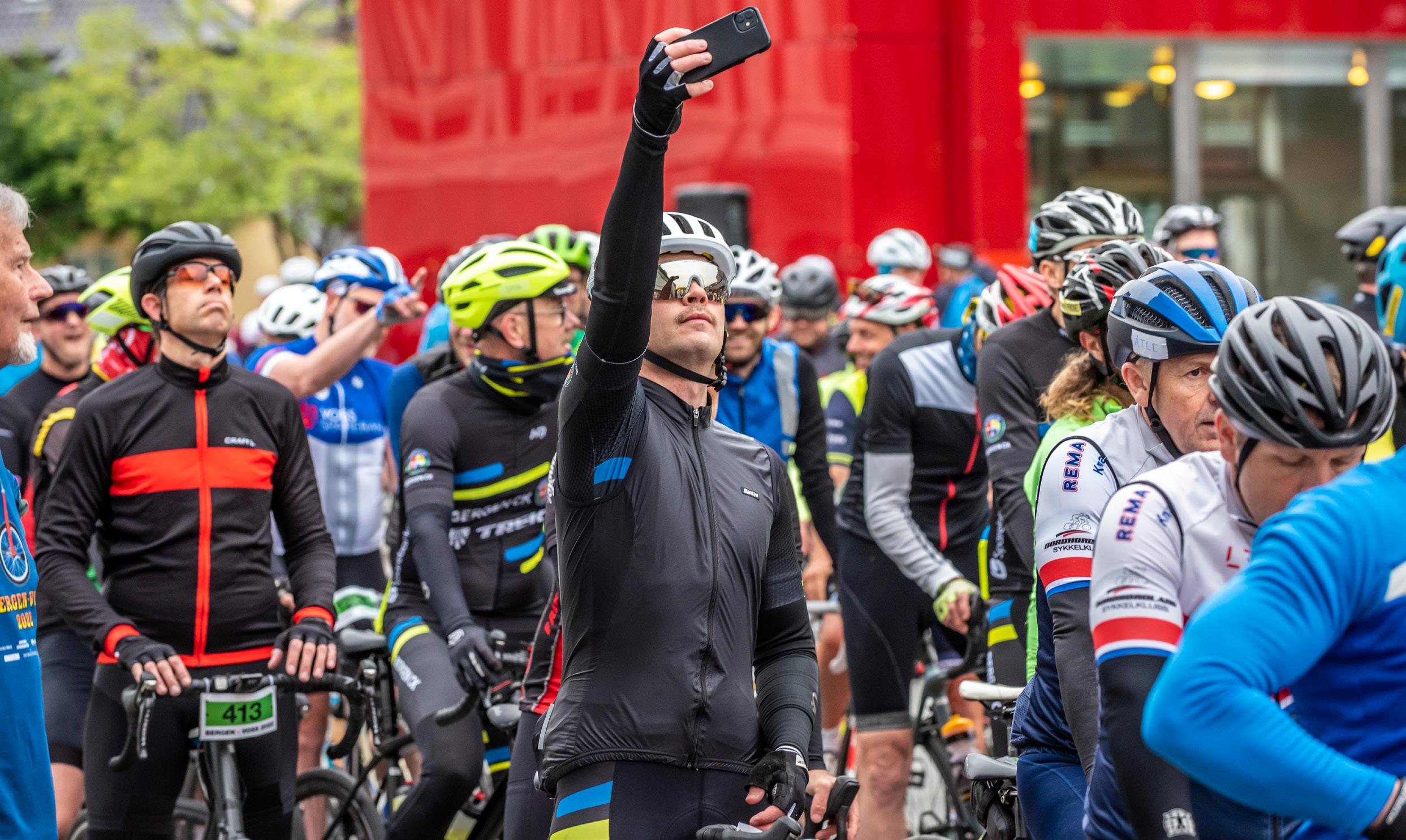Forside: Ivrige syklister etter startskuddet har gått foran Grieghallen.