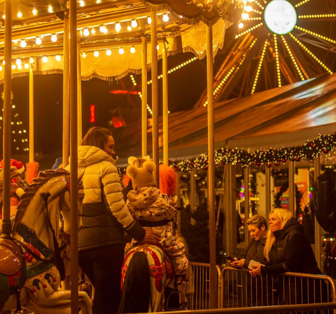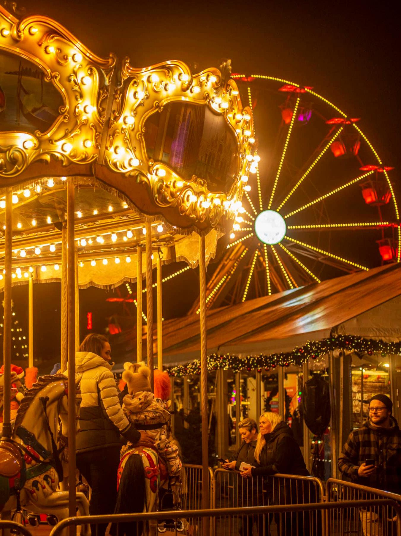 Attraksjoner som pariserhjul, elefantkarusell, hestekarusell og tekopper sørger for aktiviteter for hele familien. Billetter kan kjøpes med kort i billettbodene på julemarkedet.