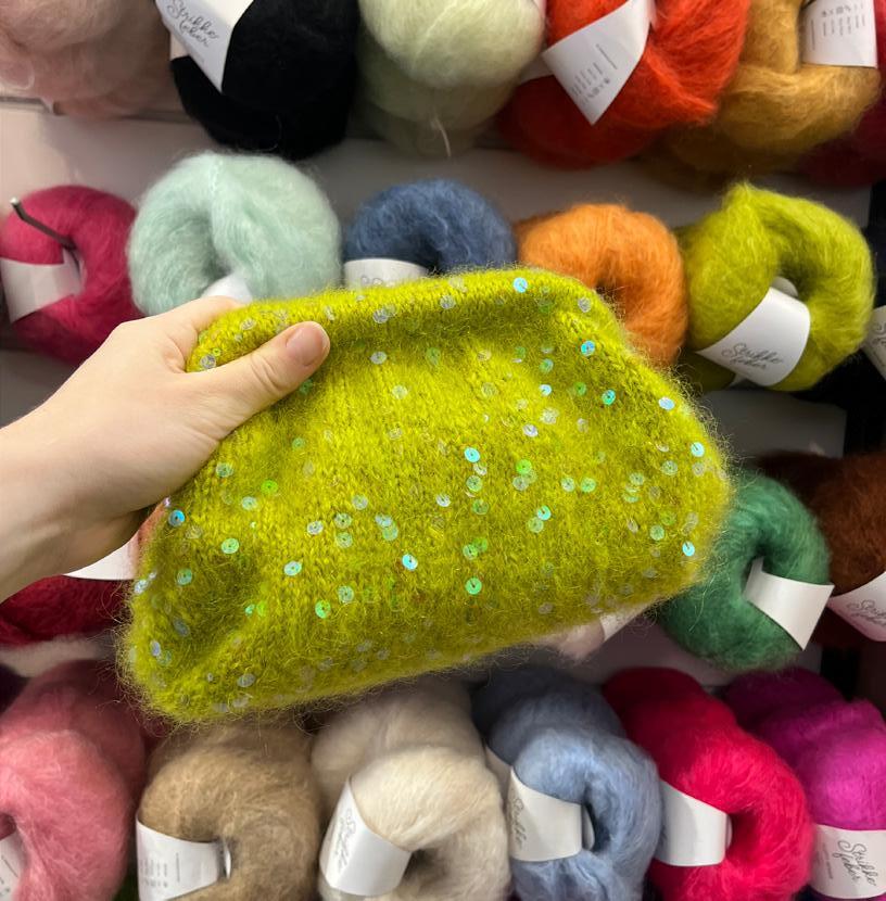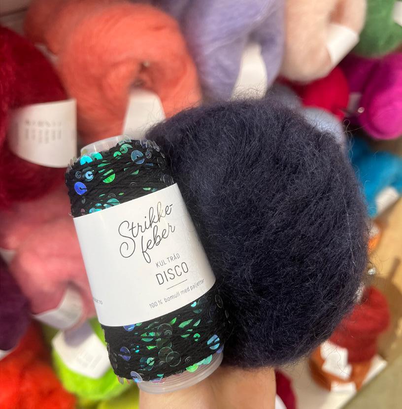 Her er en strikket variant, med paljetter og mohair-garn. Her er det mange fine kombinasjoner å velge mellom!
