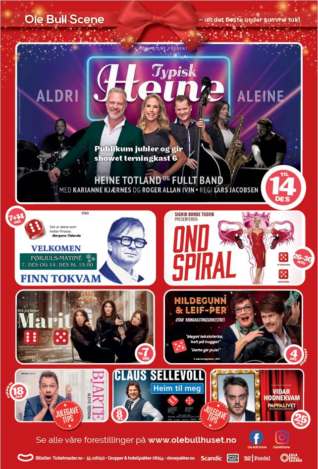 En tur på Bergen Kino er for mange også et must, enten før julaften eller i romjulen Da kan hele familien samles over koselige julefilmer eller få med seg spennende premierer på store filmer Juleshow har også blitt en populær aktivitet i julemåneden for mange, og det settes opp artige og kreative forestillinger, enten du vil synge med, le eller gråte så finnes det noe for enhver smak. På Ole Bull Scene kan du i desember blant annet få med deg showene til Heine Totland, Finn Tokvam og Marit Voldsæter, og mange flere